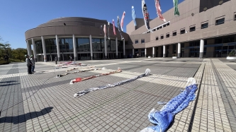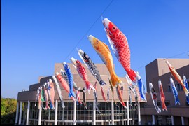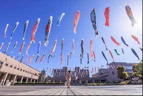 工事休館明けの5月、三重県総合文化センター(そうぶん)では、端午の節句に合わせて広場とメインエントランス上の通路に「こいのぼり」を掲揚し、来館のみなさんをお迎えします。