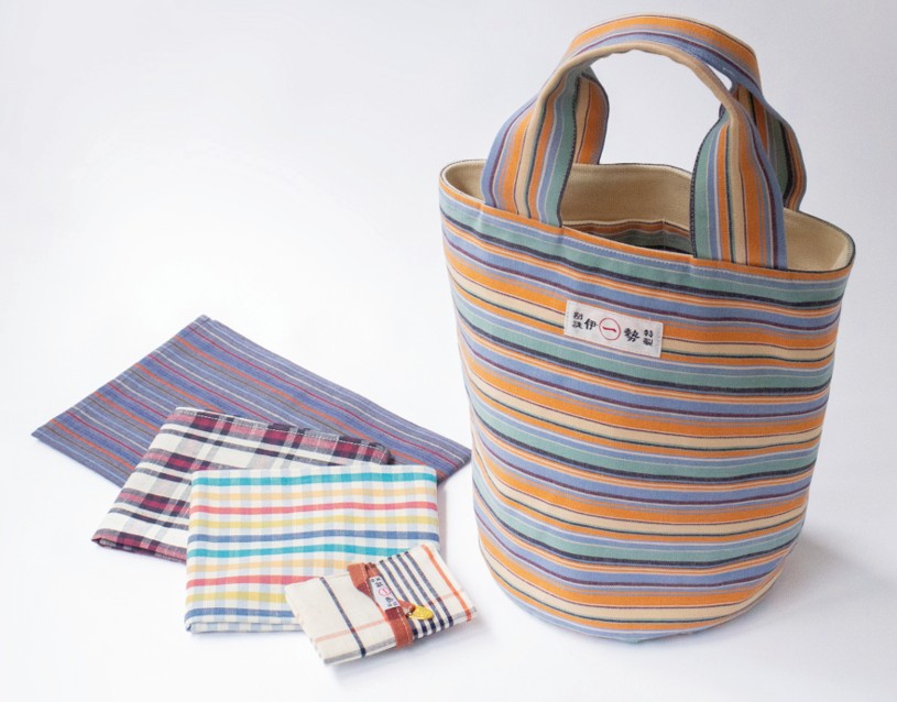 江戸時代に津藩主藤堂高虎公により木綿生産が奨励され、伊勢商人が伊勢木綿として江戸へ運びました。先染め木綿ともいわれ、織る前に糸を染める特徴があります。 |