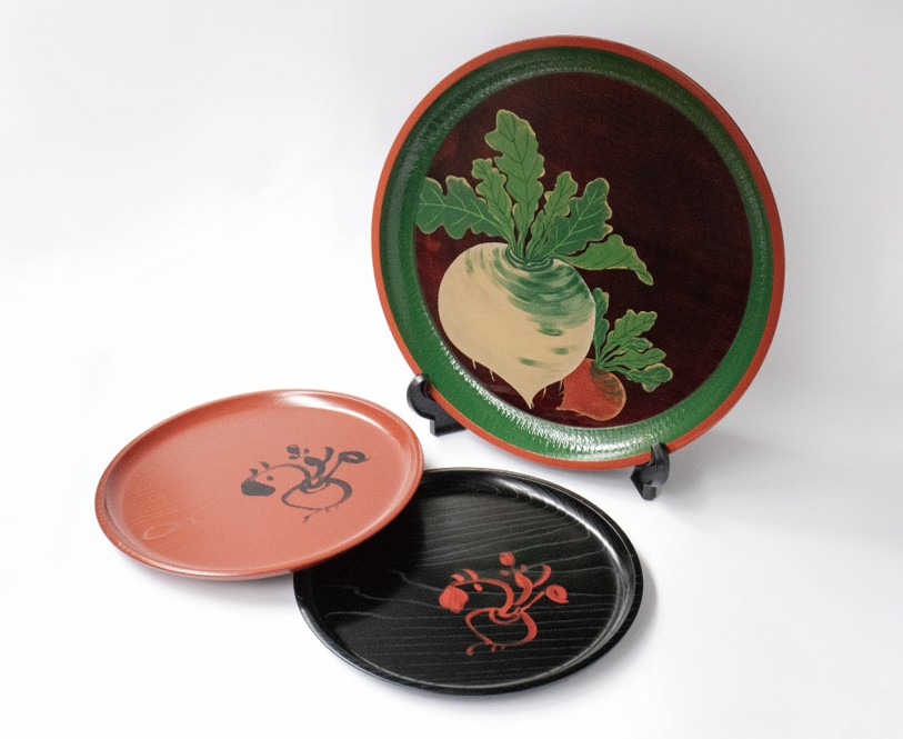 江戸時代中期に生産されはじめ、黒真塗り、木地呂塗り、青漆イジイジ塗り等の技法が施され、草花など多様な模様が描かれていました。江戸時代後期、松平定信(楽翁公)が文人画家の谷文晁に命じて、桑名盆にかぶらの絵を描かせ将軍家へ献上したところから、特にかぶら盆と呼ばれ有名になりました。 |