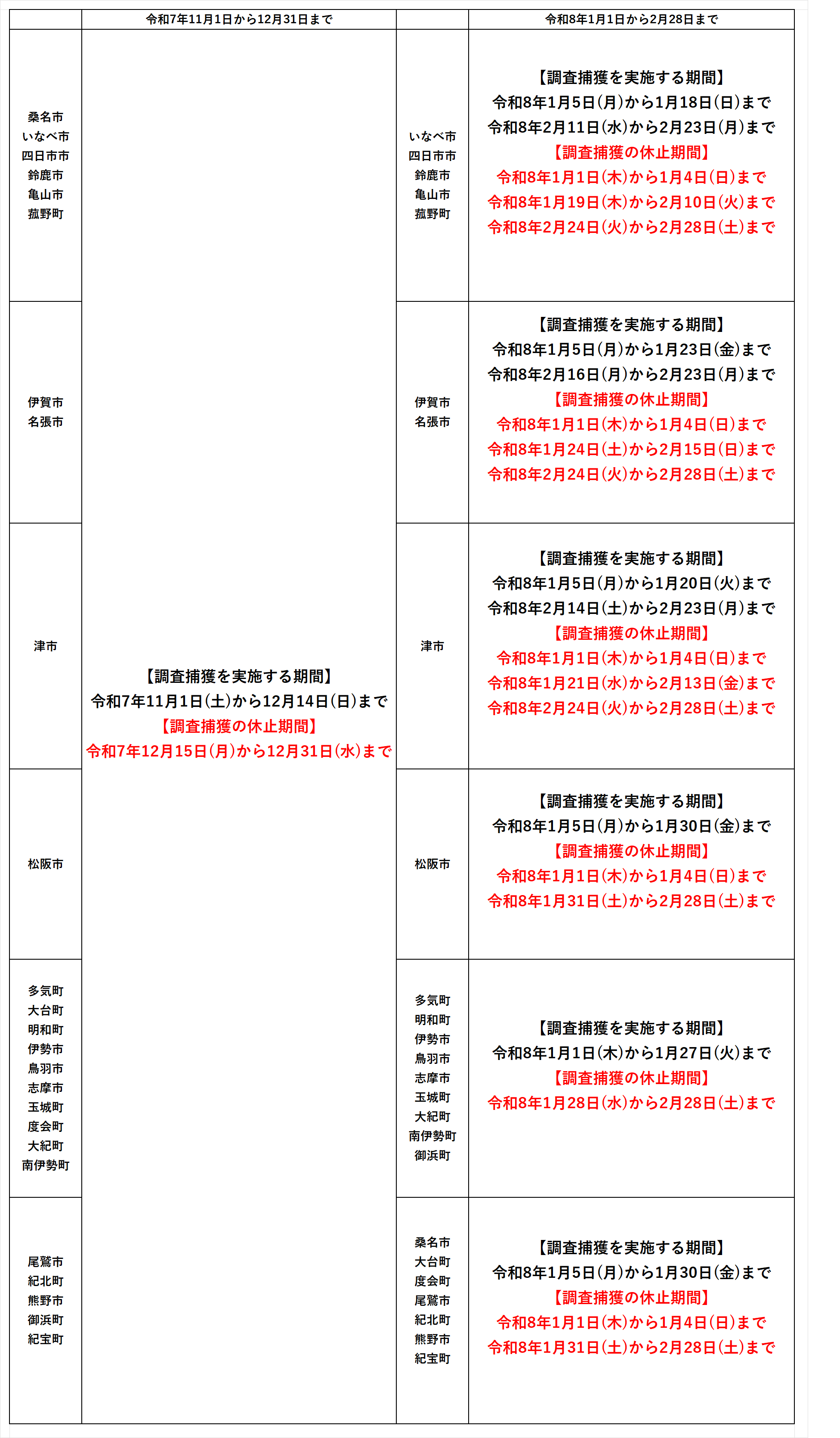 1月及び2月の調査捕獲スケジュールは変更ありません。実施期間の詳細は、下記からご確認お願いします。