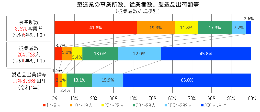 従業者数の規模別(きぼべつ)の事業所数・従業者数・製造品出荷額等の割合