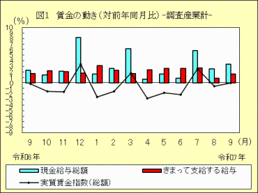 1 賃金の動き(事業所規模5人以上)「きまって支給する給与」は、対前年同月比1.6%増の273,439円「きまって支給する給与」は273,439円で対前年同月比1.6%増、賞与など「特別に支払われた給与」を合わせた「現金給与総額」は281,843円で対前年同月比3.4%増でした。また、「実質賃金指数(総額)」は80.5で前年同月並でした。