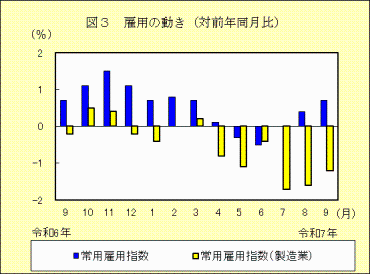 3 雇用の動き(事業所規模5人以上)「常用雇用指数」は、対前年同月比0.7%増の105.2「常用雇用指数」は105.2で対前年同月比0.7%増でした。このうち、「製造業の常用雇用指数」は97.2で前年同月比1.2%減でした。