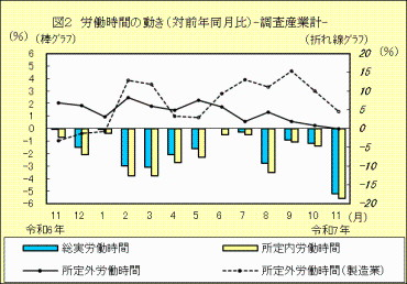 2 労働時間の動き(事業所規模5人以上)「総実労働時間」は、対前年同月比5.2%減の134.4時間「総実労働時間」は134.4時間で対前年同月比5.2%減、「所定内労働時間」は123.5時間で対前年同月比5.6%減、「所定外労働時間」は10.9時間で前年同月並みでした。このうち、「製造業の所定外労働時間」は16.1時間で対前年同月比4.5%増でした。