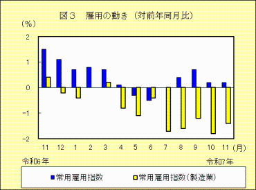 3 雇用の動き(事業所規模5人以上)「常用雇用指数」は、対前年同月比0.2%増の105.3「常用雇用指数」は105.3で対前年同月比0.2%増でした。このうち、「製造業の常用雇用指数」は97.3で対前年同月比1.4%減でした。