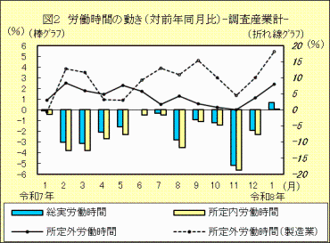 2 労働時間の動き(事業所規模5人以上)「総実労働時間」は、対前年同月比0.7%増の127.7時間「総実労働時間」は127.7時間で対前年同月比0.7%増、「所定内労働時間」は117.0時間で対前年同月比0.1%増、「所定外労働時間」は10.7時間で対前年同月比8.1%増でした。このうち、「製造業の所定外労働時間」は16.2時間で対前年同月比18.2%増でした。