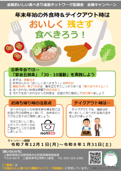 外食時の「おいしい食べきり」全国共同キャンペーンは、全国おいしい食べきり運動ネットワーク協議会により実施されています。