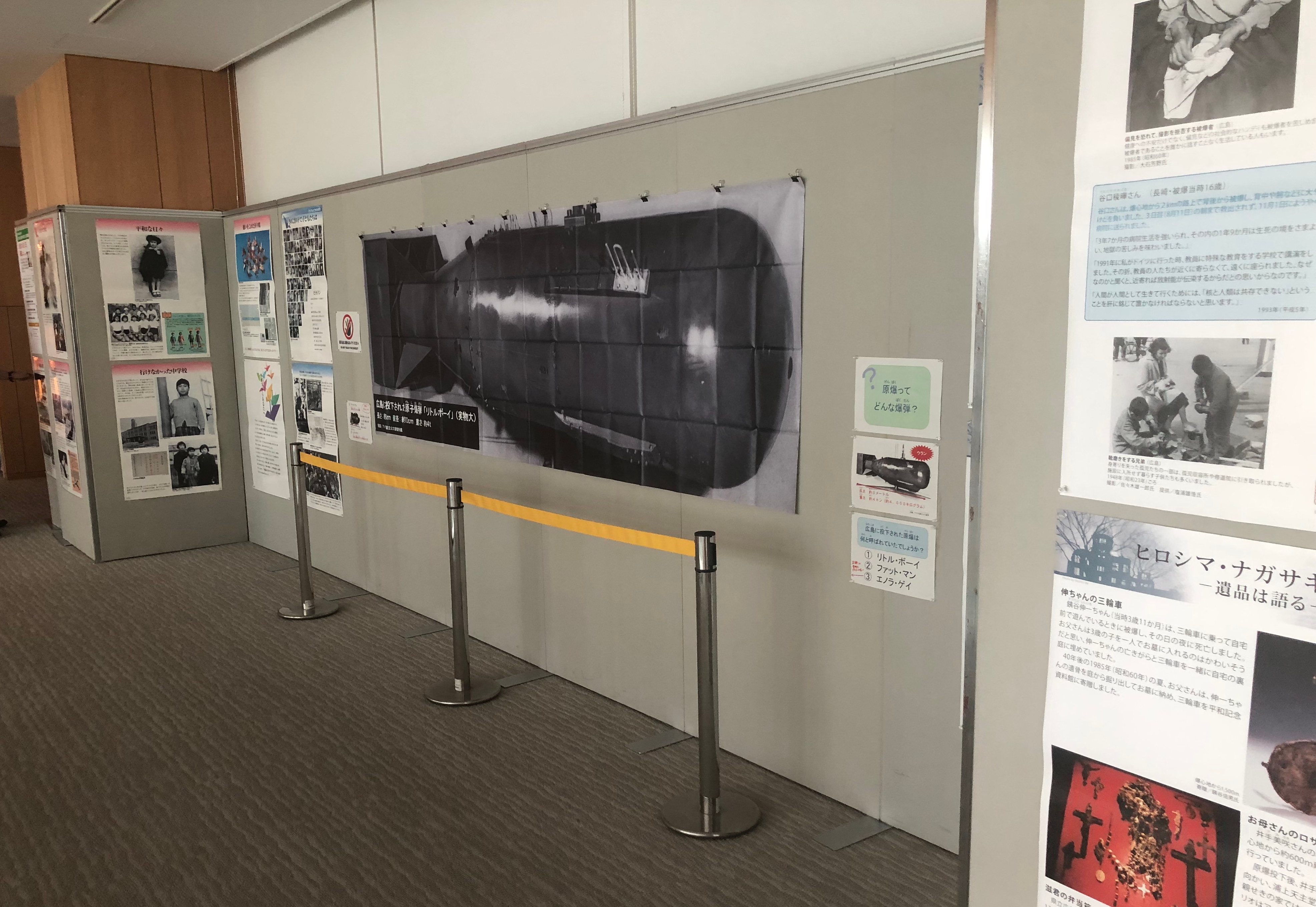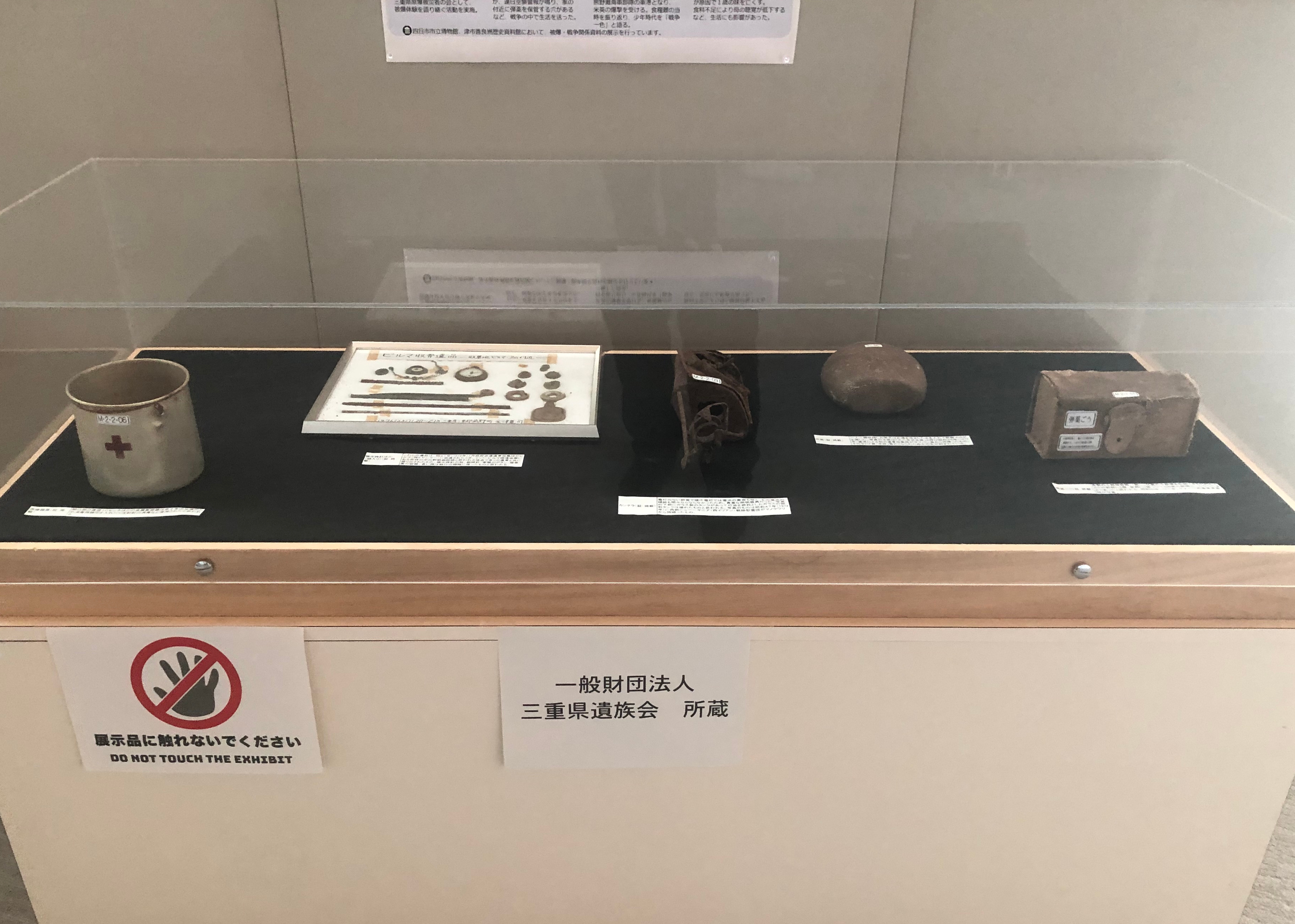 三重県遺族会が所蔵する当時の兵士の携行品などの実物に加えて、広島平和記念資料館所蔵の、広島に投下された原子爆弾の実物大ポスターや広島・長崎の原爆被害の様子がわかる写真パネルを展示しました。