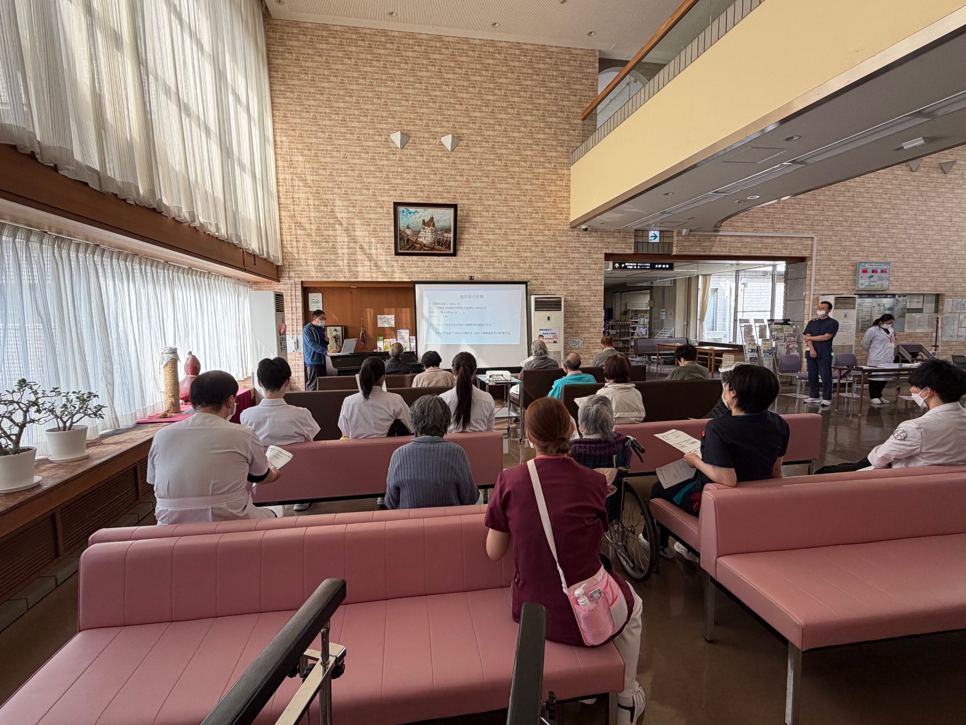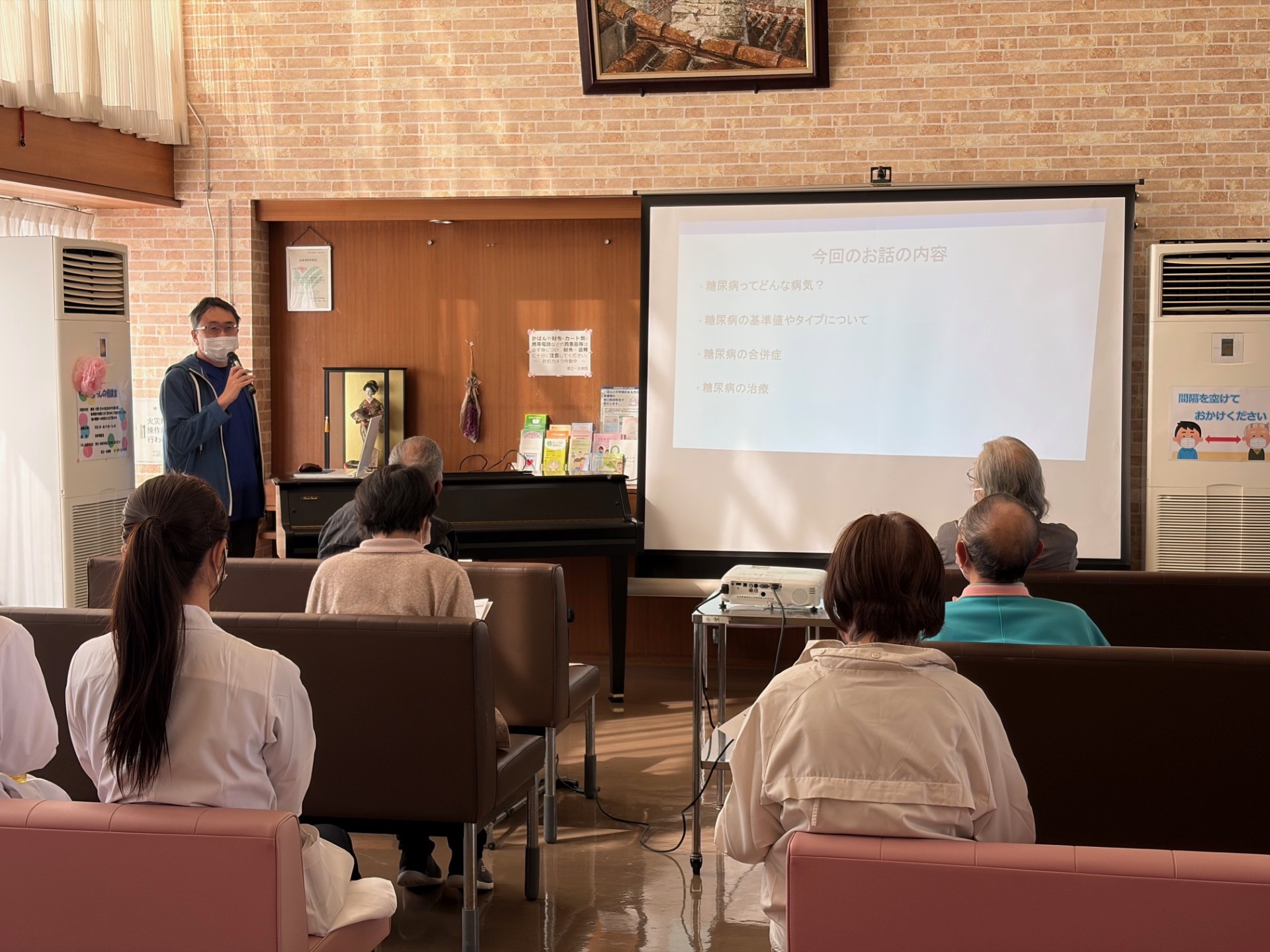 3月6日(金)、糖尿病教室を開催しました。冒頭ではアイスブレイクとして実習中の医学生による自己紹介やクイズを行い、参加された皆さまと楽しく交流しました。その後当院の中根慶太医師(糖尿病専門医)から「糖尿病を理解しましょう!」をテーマに、イラストを交えて説明しました。糖尿病は血液中のブドウ糖が増えすぎる(血糖が上がる)病気で、血糖を下げるホルモンであるインスリンが十分に作用しないために発症します。 また、血糖が高い状態が続くことで合併症も発症してしまいます。治療法としては、大きく分けて「運動」「食事」「薬」の3つがあり、自身で実践できることや糖尿病と向き合う心得について紹介しました。当院では、今後も健康教室等による住民啓発に取り組んでまいります。