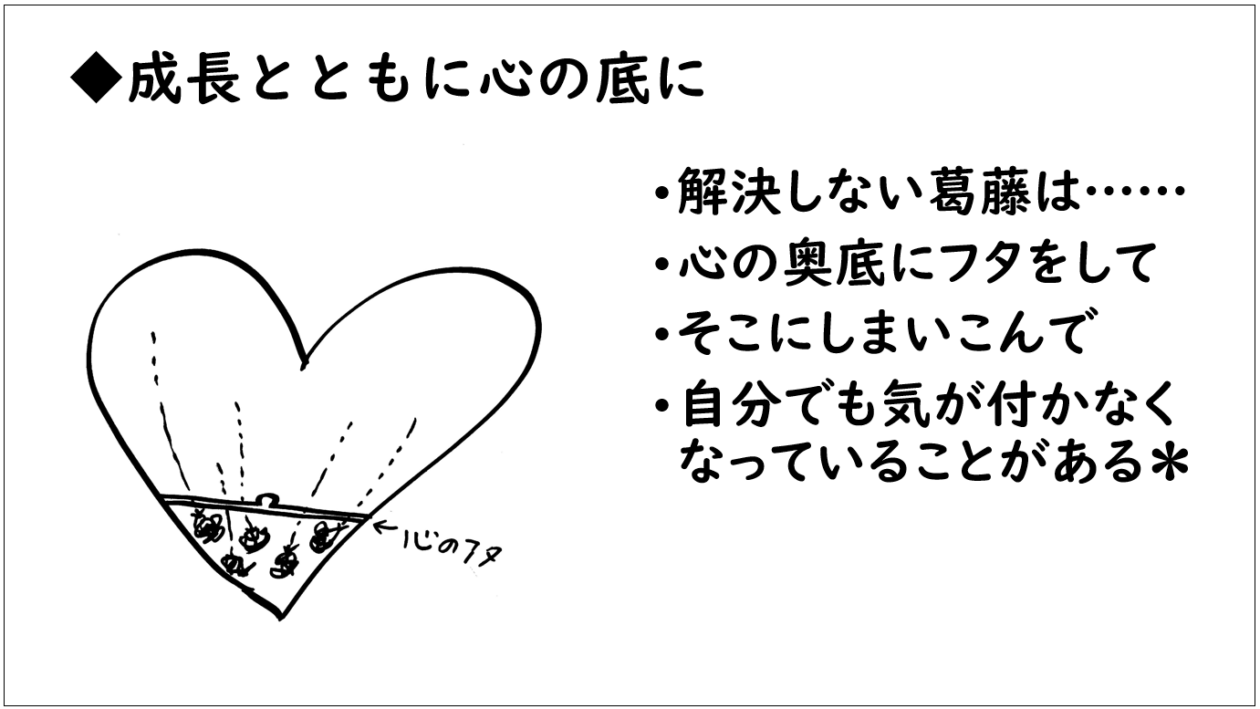 わたしは小学校6年生のころ、おねしょをするとか、運動が苦手とか、親を否定的に見るなどで、悶々としている状態でした。小学校5~6年生の頃はクラスの中でひどいいじめがあって、そのひどいいじめに2列めから加担をするという子どもでした。これも自分を責める要因の一つになりました。おねしょするなどは自然に解消します。一方で、それら以外の葛藤は、解決しません。例えば「人の顔色をうかがって八方美人になって暮らしている」というふうに自分の性格を毛嫌いしました。これらの解決しない葛藤は心の底にしまいこんで暮らすようになります。そのままでいると、自分自身あまりそう気づかなくなっていることがあるのです。わたしの場合は、大学に入ったときにこういう感じでした。(下記スライド参照)