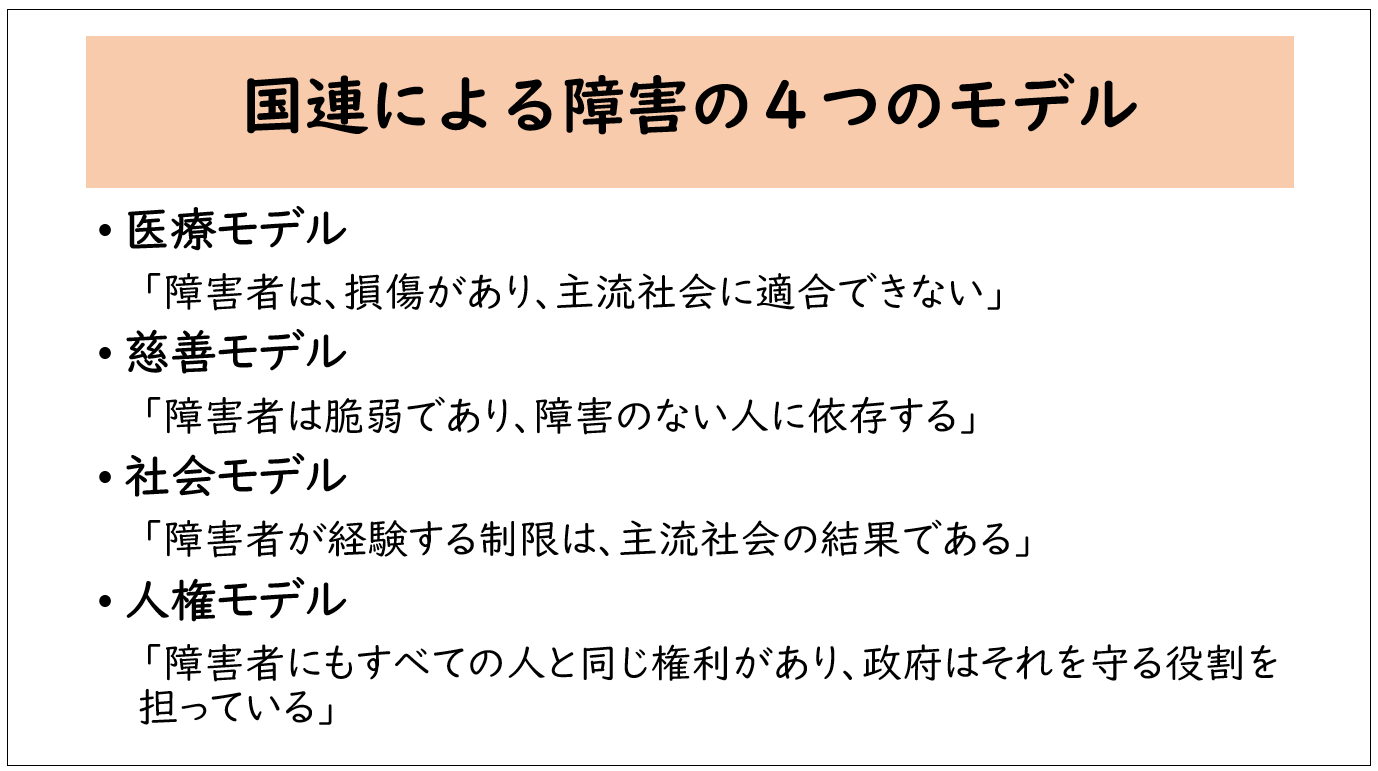 国連は今、障がいをめぐって4つのモデルがあると言っています(下記スライド参照)。医療モデル、慈善モデル、社会モデル、人権モデルです。これまでは、医療モデル(個人モデル)と社会モデルを対比して説明することが多かったです。要するに、医療モデルは、「障がい」はその人の側にあり、その人が機能訓練や治療等をして社会に入っていけるようにするべきだという考え方です。それに対して、社会モデルは、「障がい」は社会が発生させているもので、社会の側にあるという考え方です。そのため、「社会の側は、その人たちが十分社会参加できるようにバリアをなくすべきだ」という考え方が社会モデルです。これらのことについて、国連では「障害者の権利に関する条約」(以下、「障害者権利条約」)をつくる際に議論を重ねて明確にしてきたのですが、その議論の中で、社会モデルでは不十分だということがはっきりしてきました。そして今、国連が提唱しているのが、4番めの人権モデルです。人権モデルとは「障がい者にも、すべての人と同じように『人権』があって、それを保障するのが国の責務だ」という考え方です。