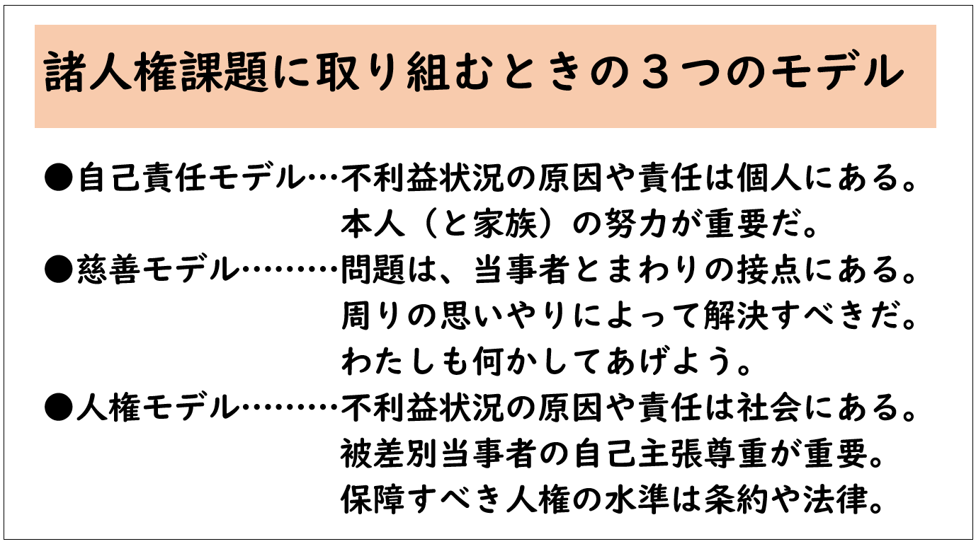 以上は障がいに関するモデルのことですが、それをさまざまな人権問題について適用したらどうでしょう。自己責任モデル、慈善モデル、人権モデルがあるというのがここでの話です(下記スライド参照)。慈善モデルは、国連の4種類のモデルの中に既に入っていました。自己責任モデルは、先ほどの医療モデルと同じようなものです。「不利益状況の原因や責任は個人にあるのだから、本人の努力が重要だ」という主張です。この考えでいると、障がい者問題の場合で言えば、分離教育に進みやすくなります。それに対して、人権モデルというのは「不利益状況の原因や責任は社会にある」という考え方です。さらに、「被差別当事者の自己主張を尊重することが重要」「保障すべき人権の水準は条約や法律」というのも、人権モデルだということです。これはすべての人権問題、例えば女性や外国人の人権に係る問題等でも同じだということです。ちなみに、外国人に関する「国際人権規約」という条約は、内外人平等、すなわち、日本で言えば「日本国籍を持っていようが持っていまいが、保障されるべき人権に違いはない」という考え方に基づいてつくられています。そのため、外国人差別の問題でも、人権モデルというのは十分存在しうるし、存在しなければならないということです。
