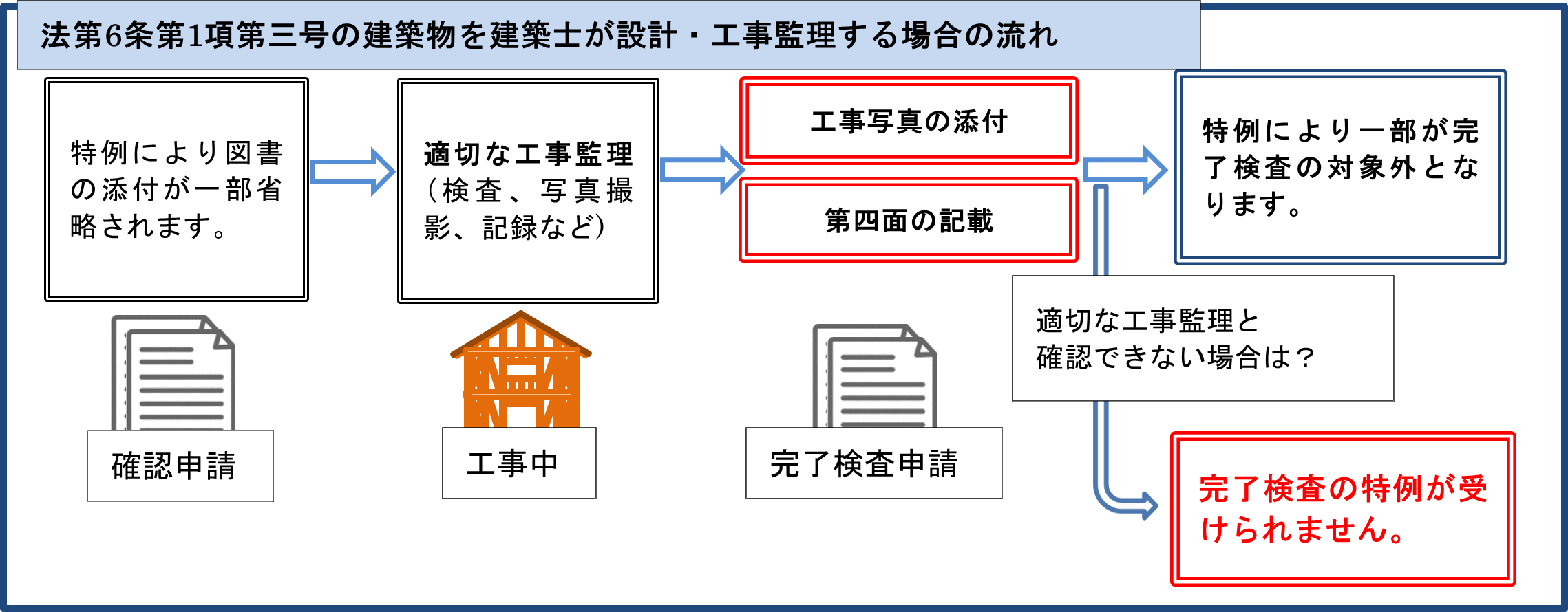 現在、建築基準法第6条第1項第三号に掲げる建築物で、建築士が設計図書を作成し、建築士である工事監理者の責任において、設計図書のとおりに実施されたことが確認されたものは、同法に基づく完了検査において、筋かいや仕口金物の確認など検査の一部が省略できる特例があります。しかし、この検査特例を受けるためには、適切に工事監理される必要があります。