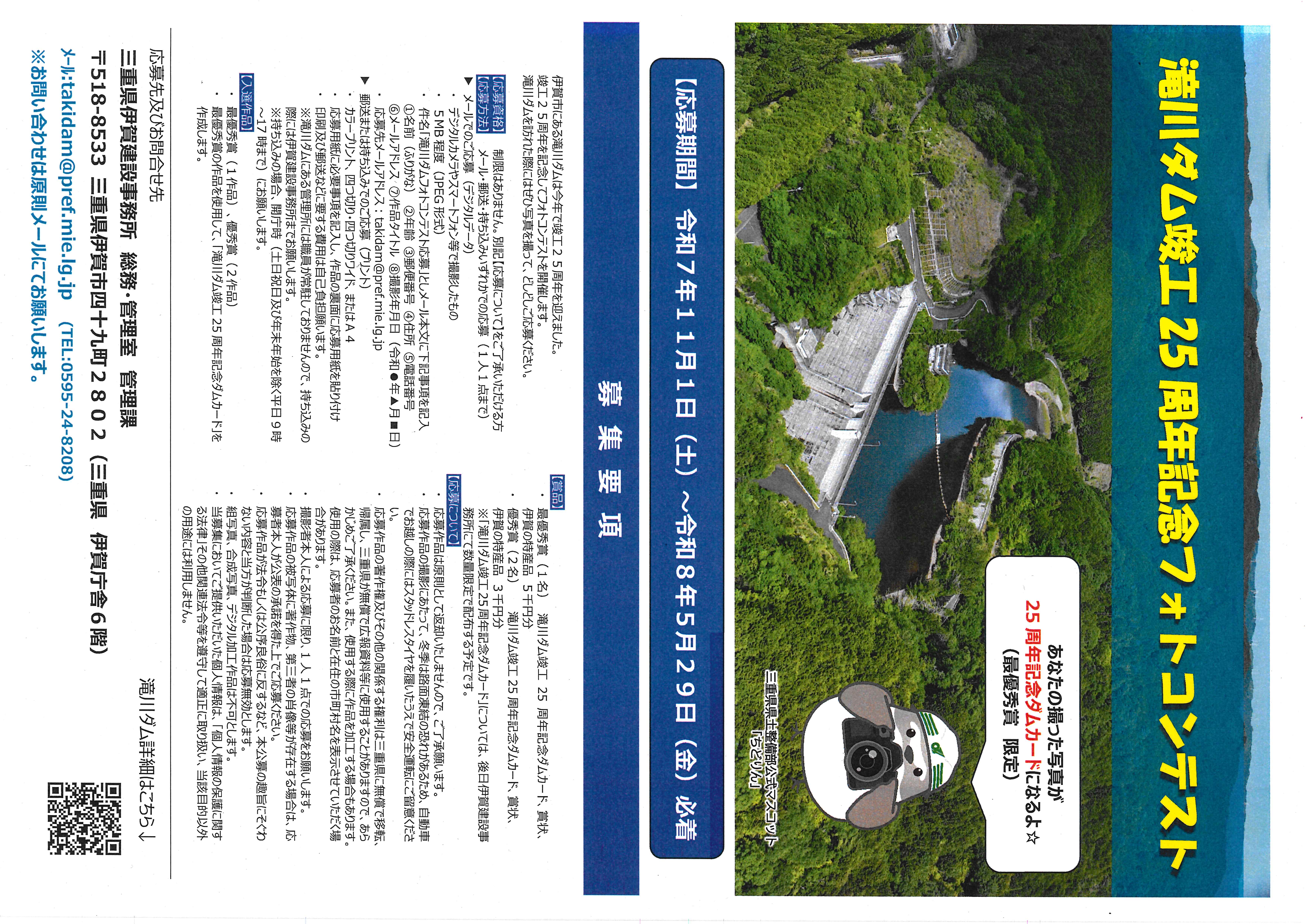 三重県が管理する滝川ダム(伊賀市高山地内)においては、令和7年10月31日に竣工25周年を迎えたことから、「滝川ダム竣工25周年記念フォトコンテスト」を開催中です。最優秀賞に選ばれた方の写真は限定ダムカードに採用され、数量限定で配布されます。