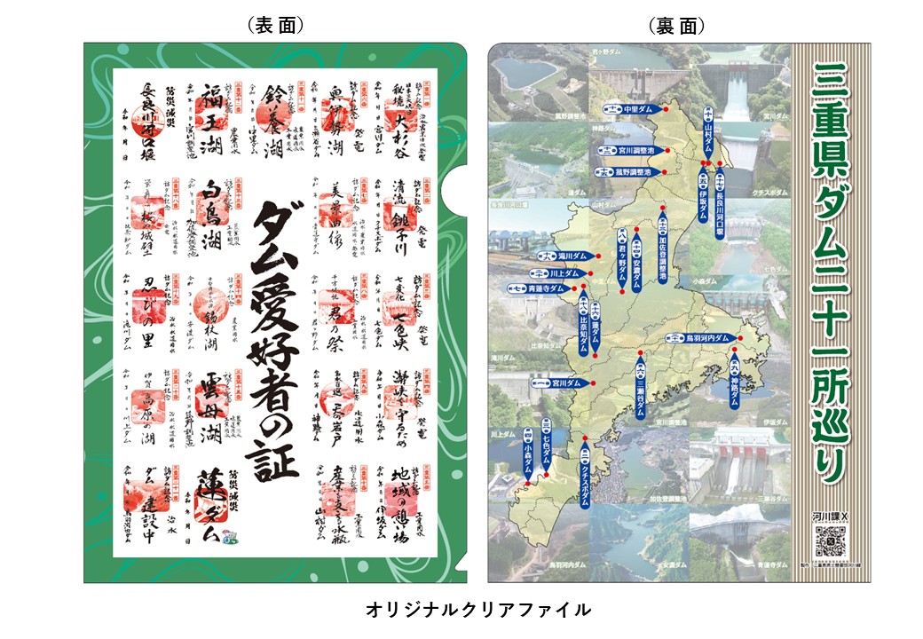 - 全21枚のダム印をすべて集められた方の中から抽選で200名様に、「認定証」と「オリジナルクリアファイル」を進呈します。