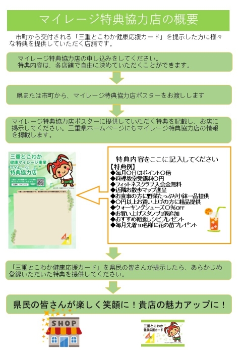 県民の皆さんは、「三重とこわか健康応援カード」を「マイレージ特典協力店」で提示することにより特典を受けることができます。