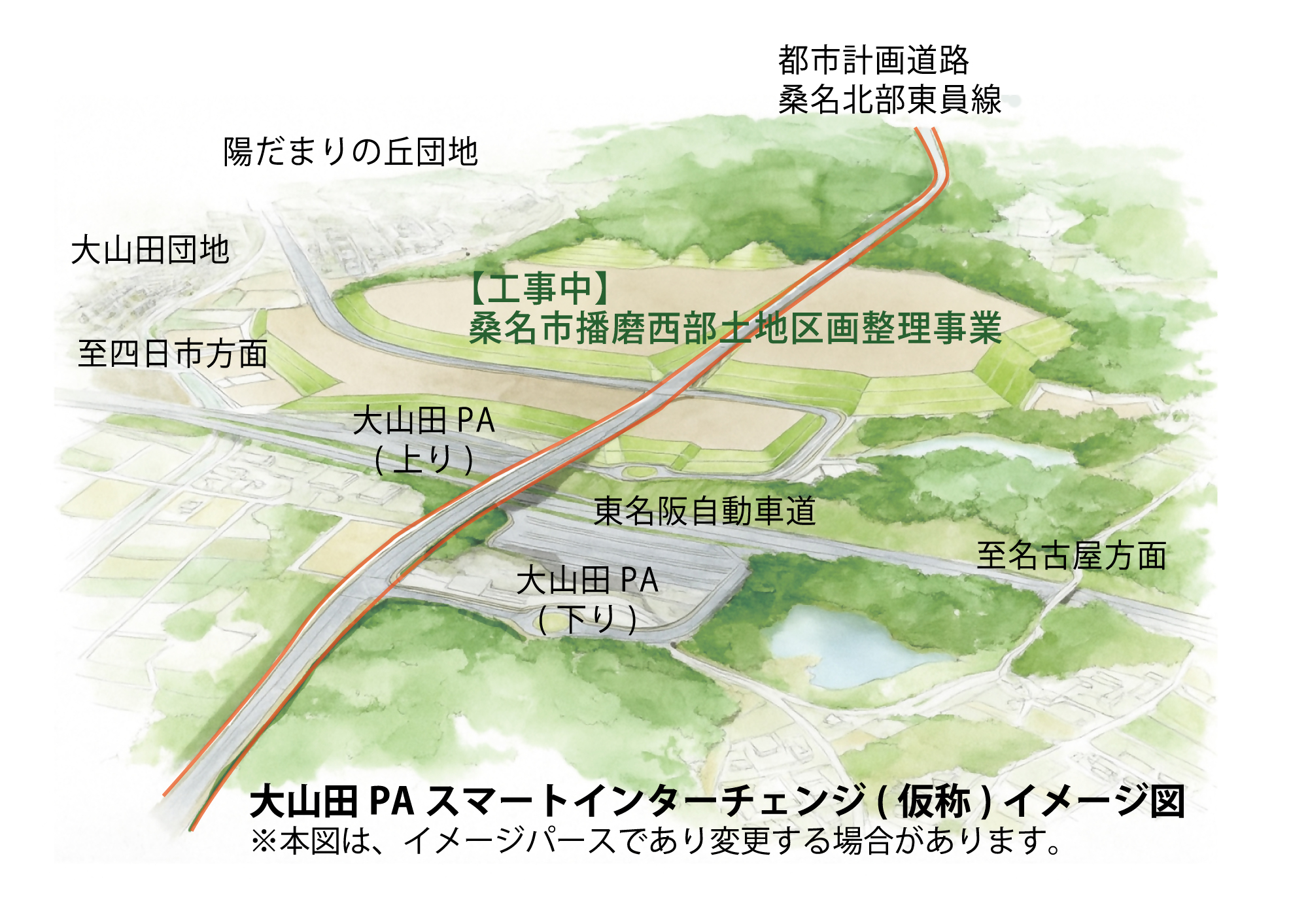 施行区域に隣接する東名阪自動車道の大山田PAにスマートインターチェンジの設置が計画されています。また、区域を横断する都市計画道路についても、歩調を合わせた整備が予定されており、立地環境に優れています。 |