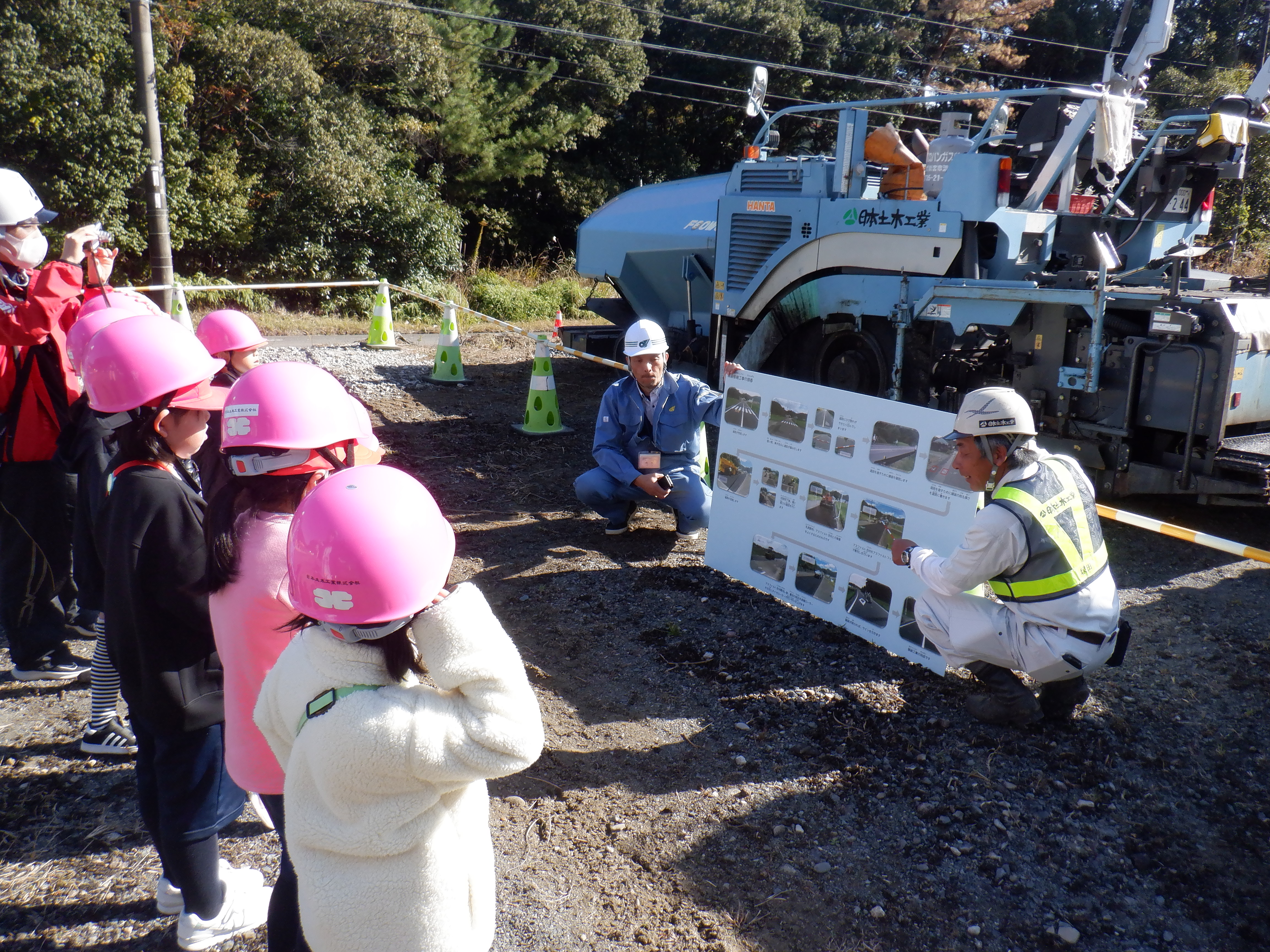 舗装修繕工事を見学することで、公共工事や工事施工を担う建設業の役割について理解を深めていただきました。