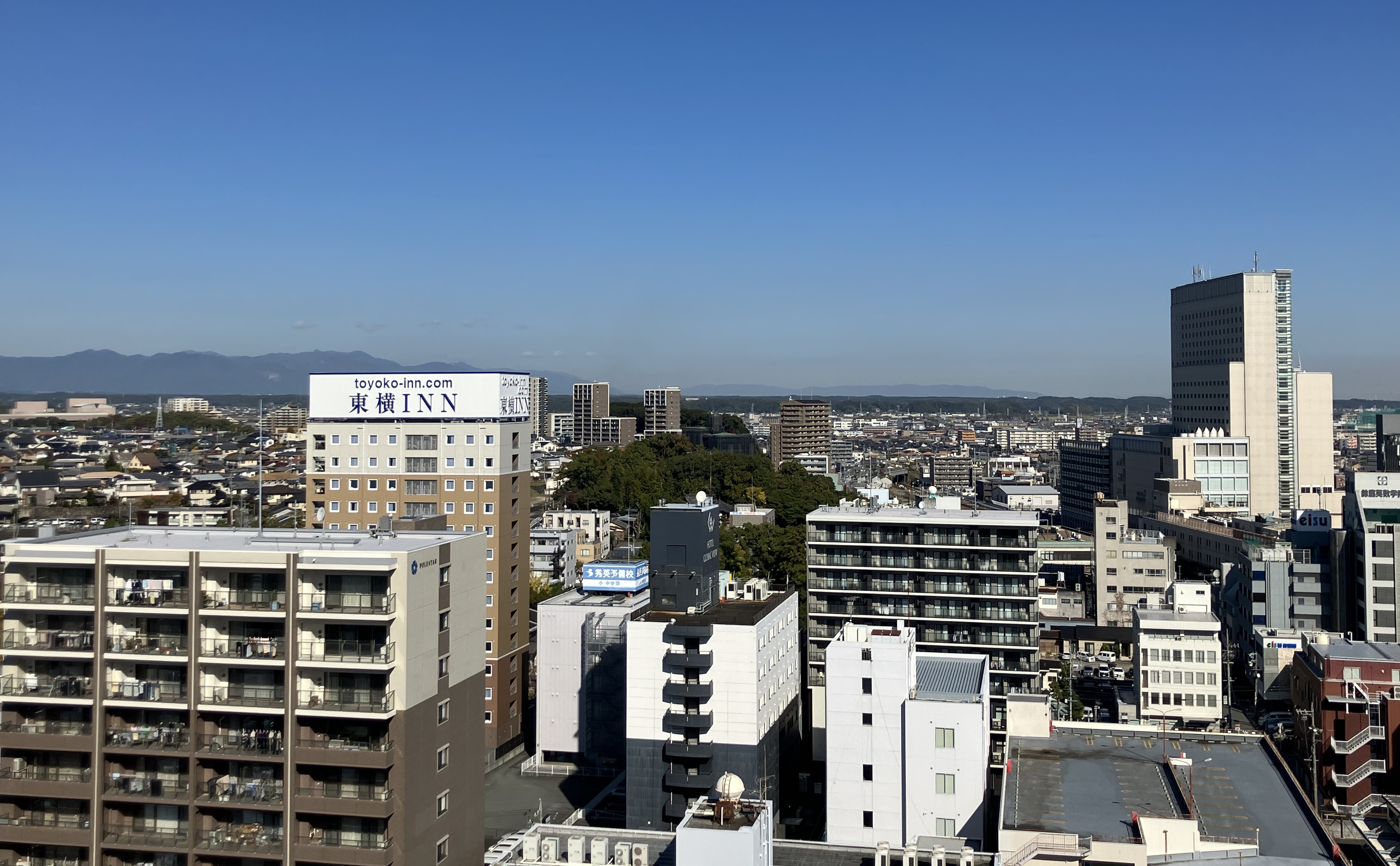 右側には津市内で一番高い建物のアスト津があります。左側には三重県総合博物館(MieMu)や三重県総合文化センターがあります。