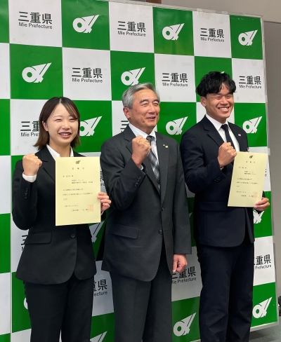 (向かって左から)みえ国際協力大使 森 亜友奈さん、三重県副知事 服部 浩、みえ国際協力大使 市川 兼伍さん ※出席予定だった増山 日和子さんは欠席されました。