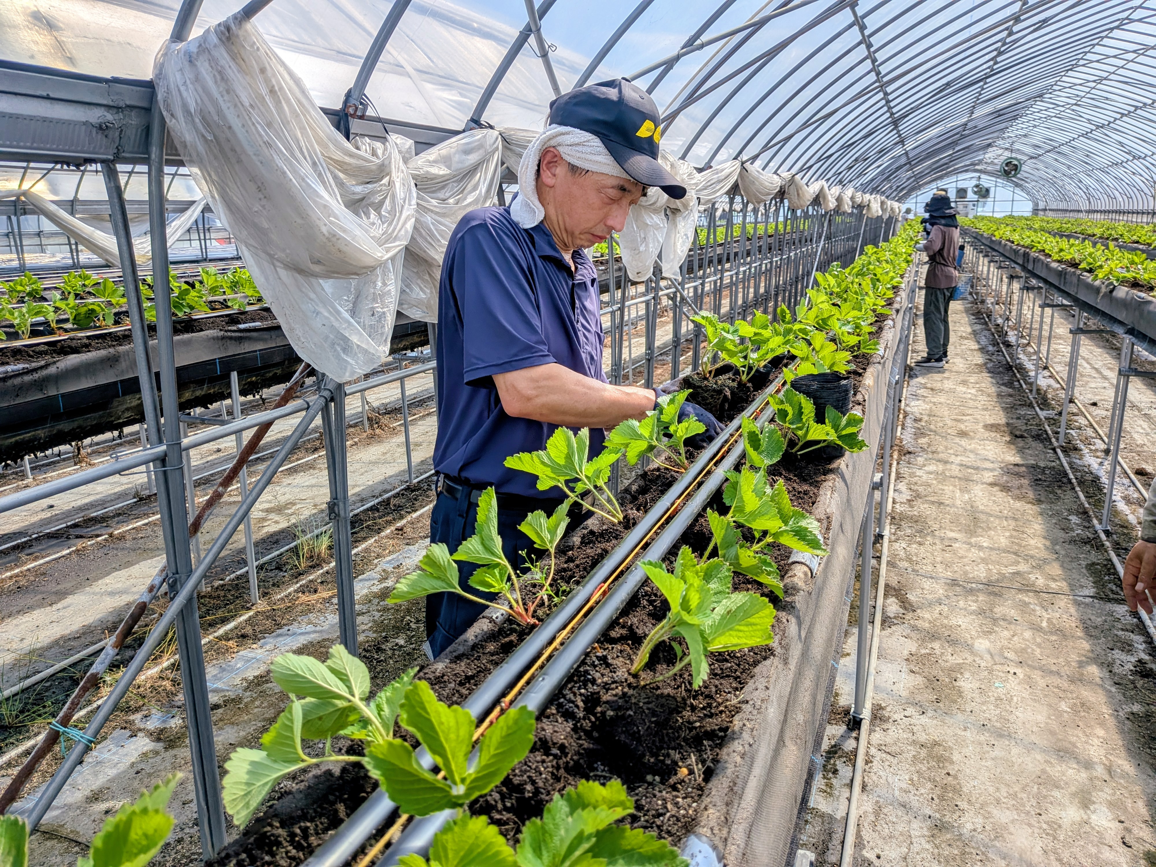 今回、作業に応募してくれたのは、近隣の運送会社に勤務する大西さんです。応募のきっかけを伺うと、「普段、野菜や果物の運送で農家さんと接する機会があり、せっかくなので自分も何かしらの形で農業に携わりたいと思いまして」とのこと。ちなみに大西さんはこれまで農業の経験は無く、今回が初めての挑戦となります。予定時刻の10分前に農場に到着した大西さんを、倉野さんが出迎えます。作業時間や報酬、熱中症対策など一通りの説明を終えた後、倉野さんの誘導で実際に作業するハウスに向かいます。今回の作業は「イチゴの定植作業」。ポットや育苗トレイの中で大きくなった苗を、一つひとつ植え替えていく作業です。