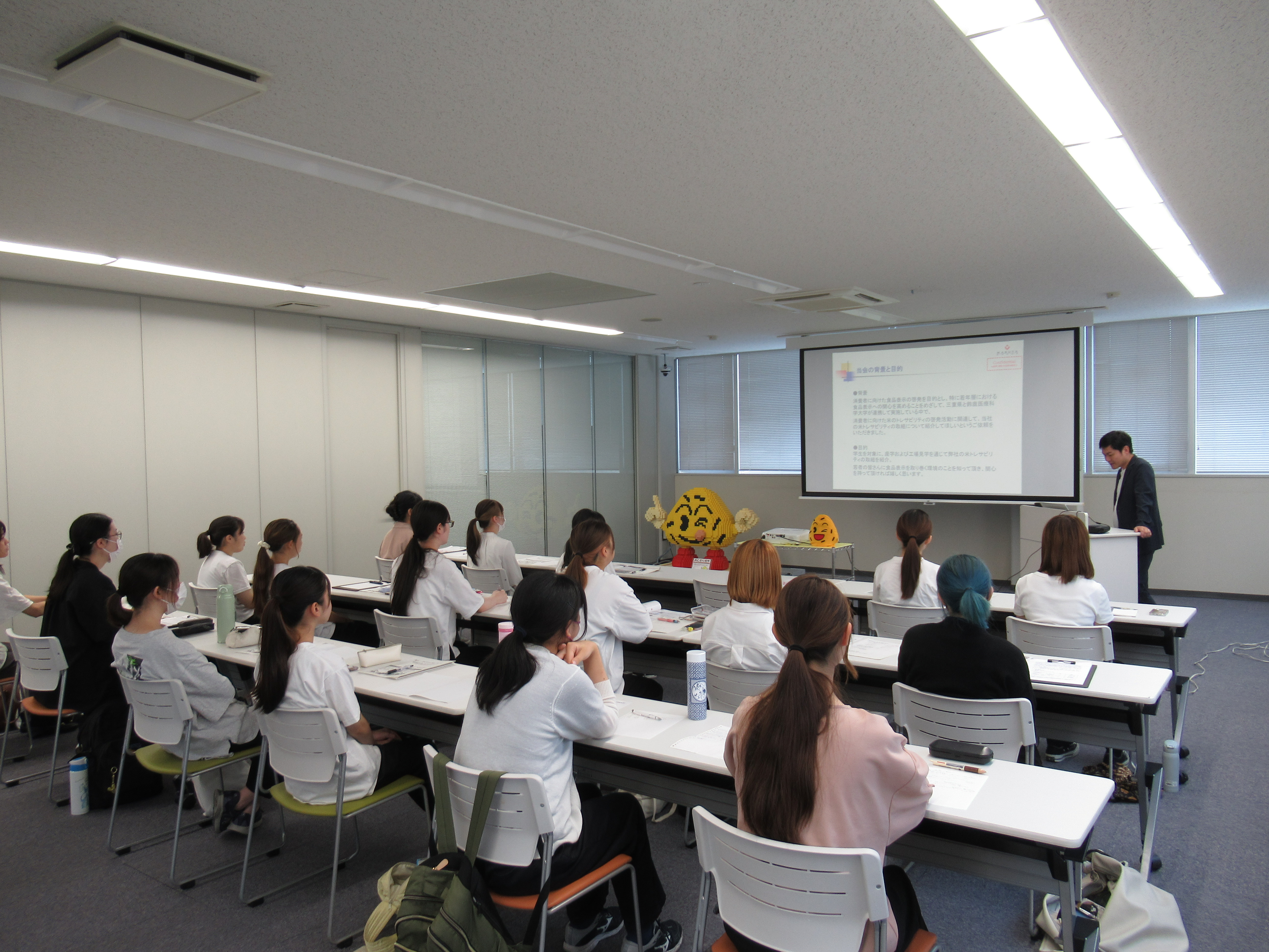 まず、会議室で、各製造工程における米のトレーサビリティに必要な情報管理・伝達方法や卸売業者・消費者に向けた情報の伝達方法の説明を受け、その後、工場を見学しました。