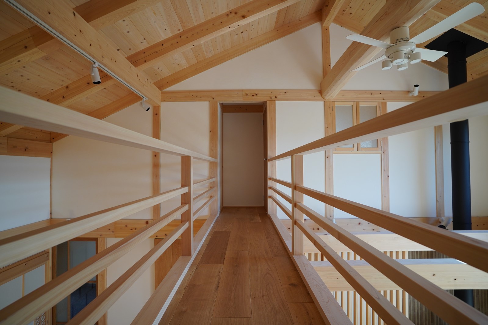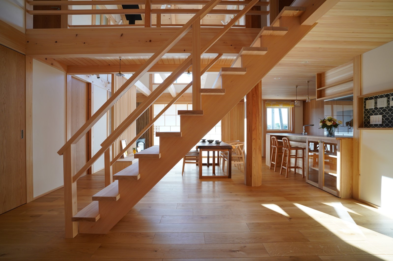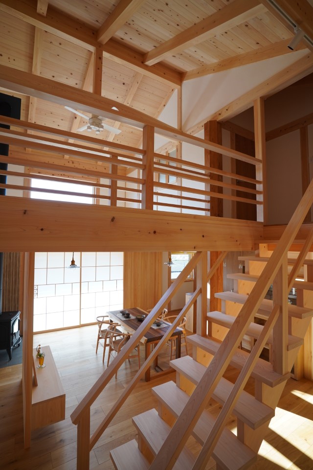 居間に配置されている大断面の柱や、ささら桁階段のように、三重県産大断面材の特徴を活かした丁寧な設計が随所に垣間見え、説得力のある空間表現がなされていた。