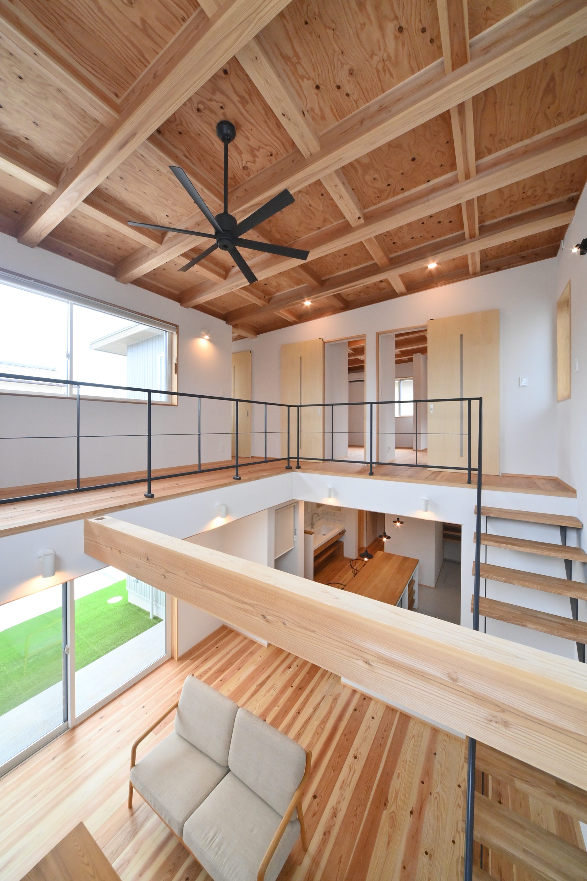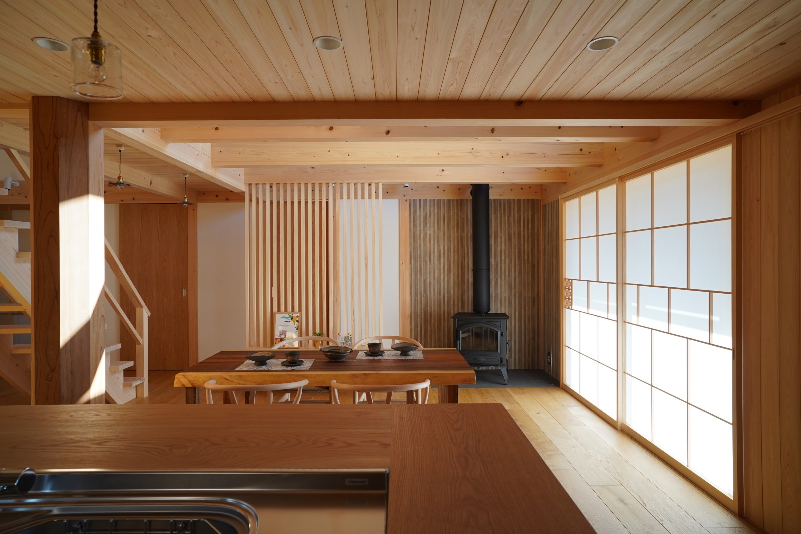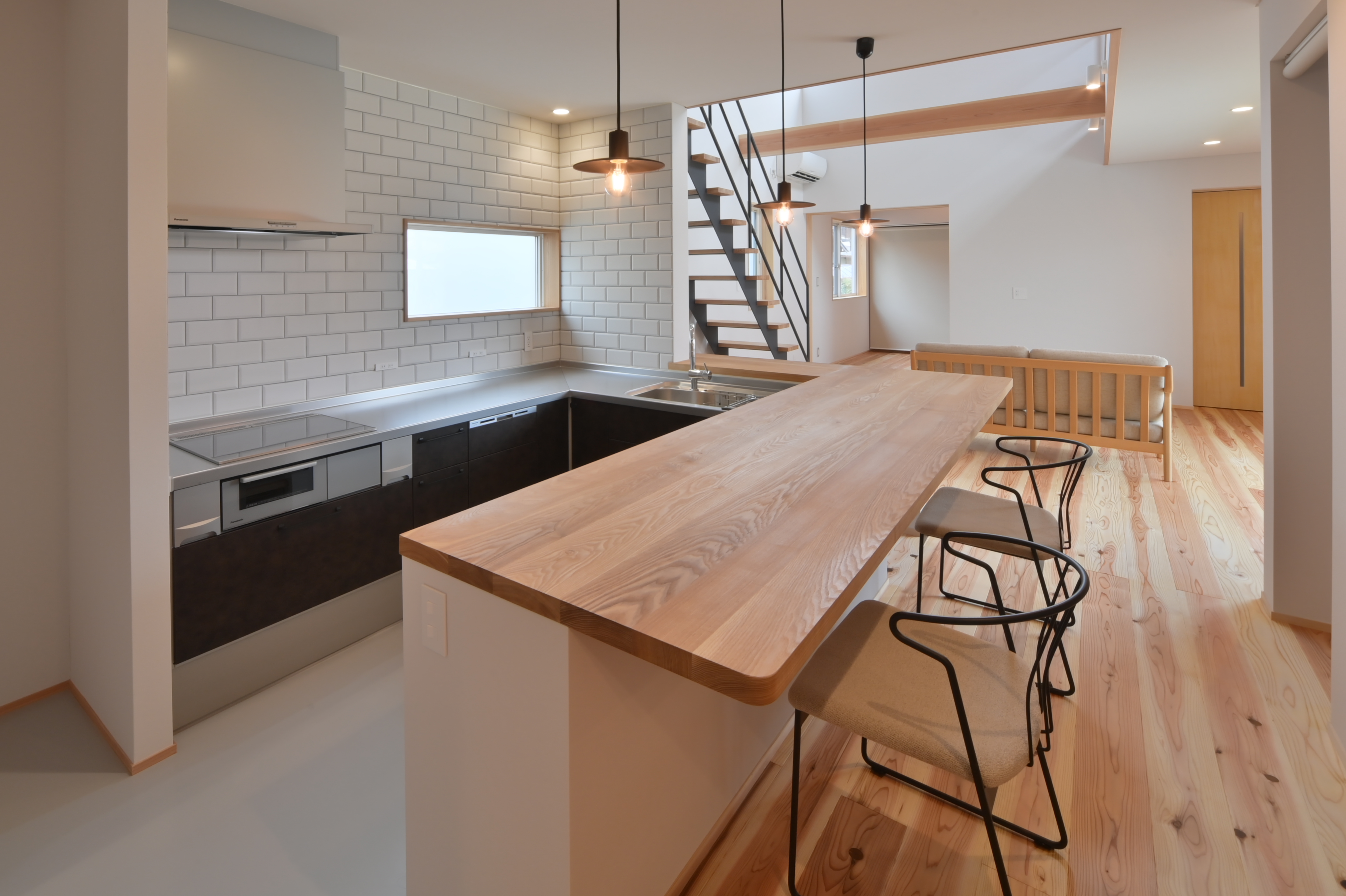 伸びやかで清々しい雰囲気が外観からインテリアへと緩やかにつながり、木の温かみがそれに寄り添うように馴染んでいる。設計者は住宅の建築を検討される方に日頃より県産材の魅力をPRされており、この建物で使用の木材も県産材が100%とのこと。施主からの「カフェのような雰囲気のキッチン」という要望にも、床の高さの工夫と共に木製の幅広のカウンターで応え、日常的に木の良さを五感で感じることができそうな住宅である。