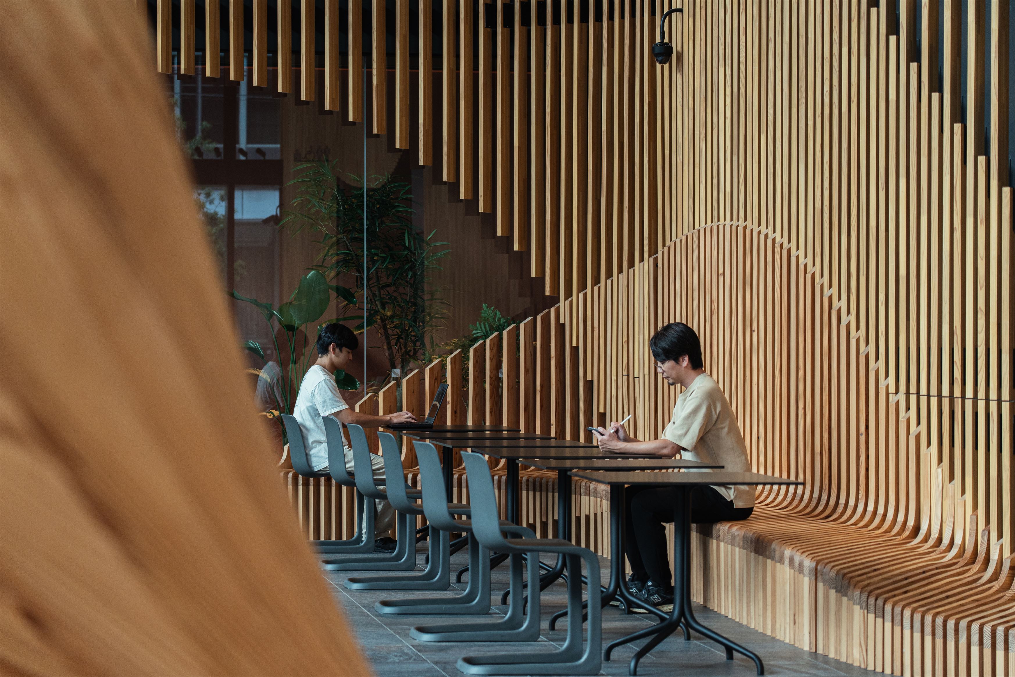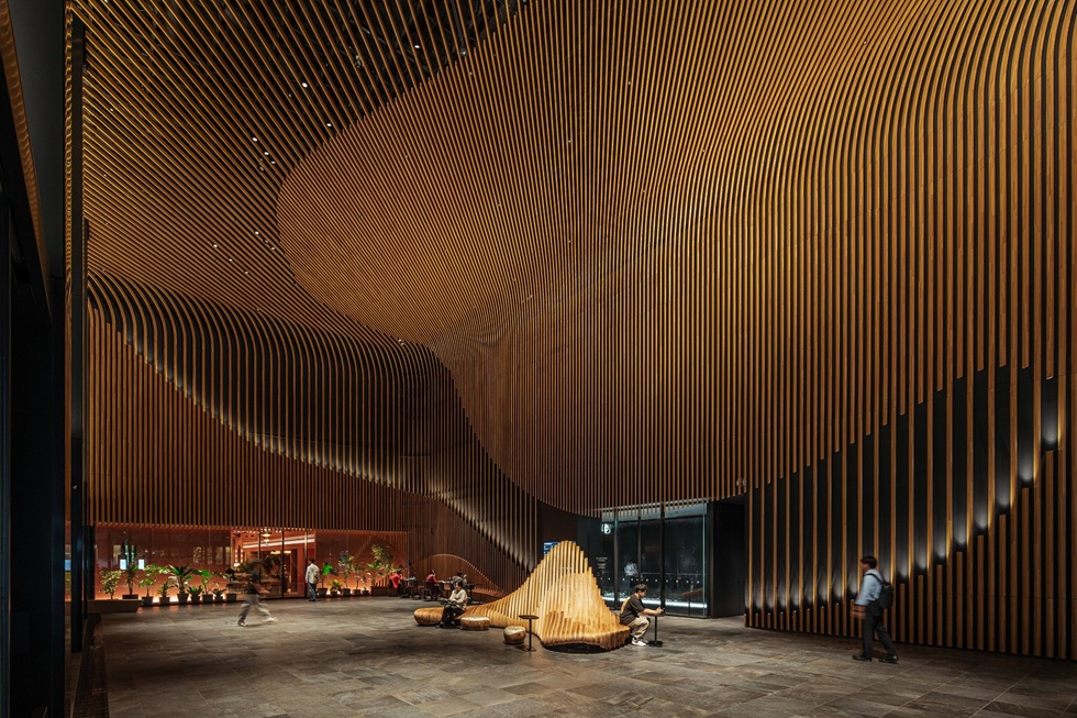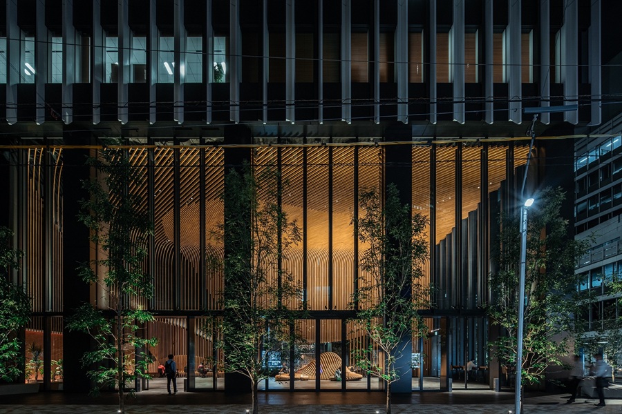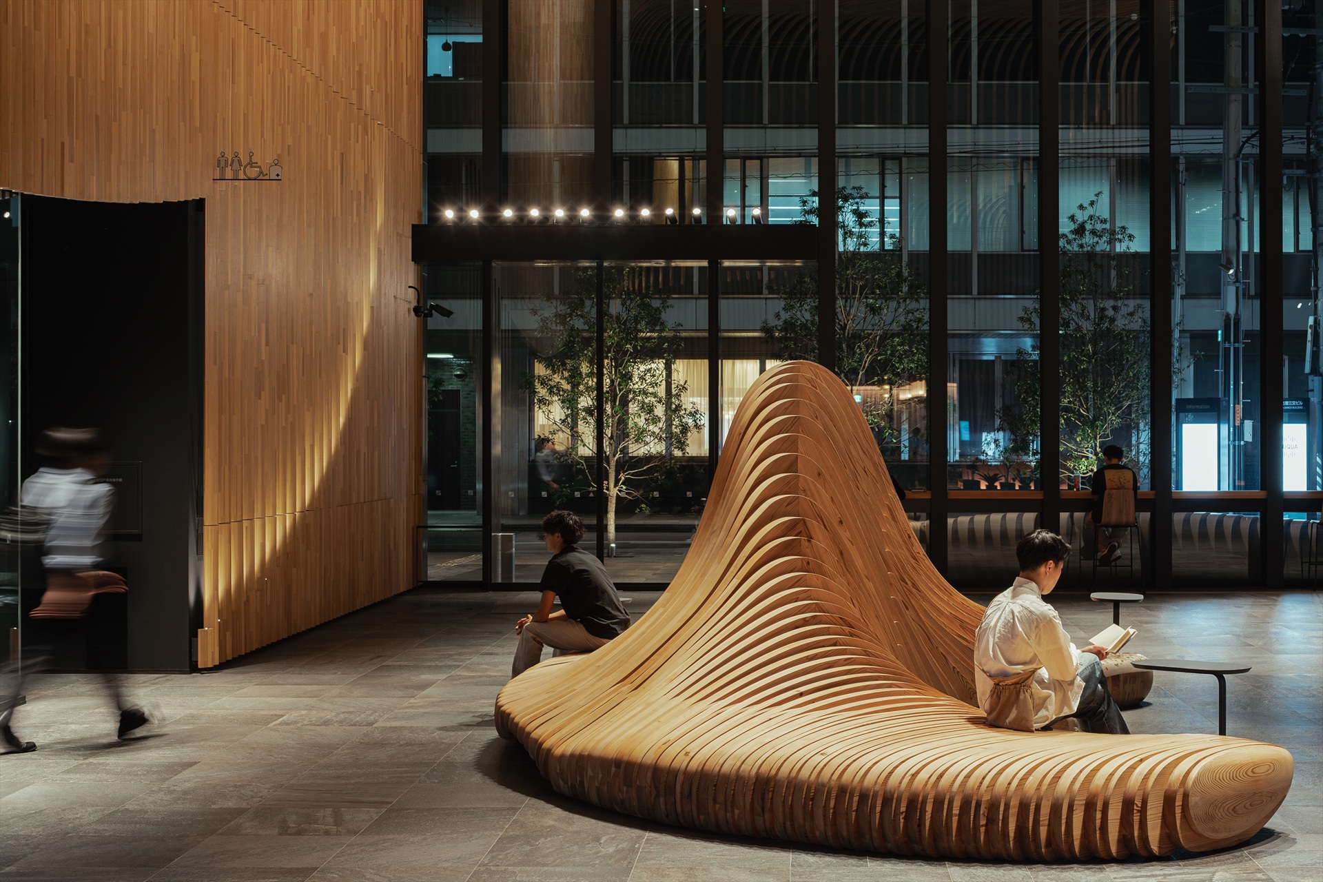 都心を行き交う人々に惜しみなく木の空間体験を提供するデザインは秀逸である。