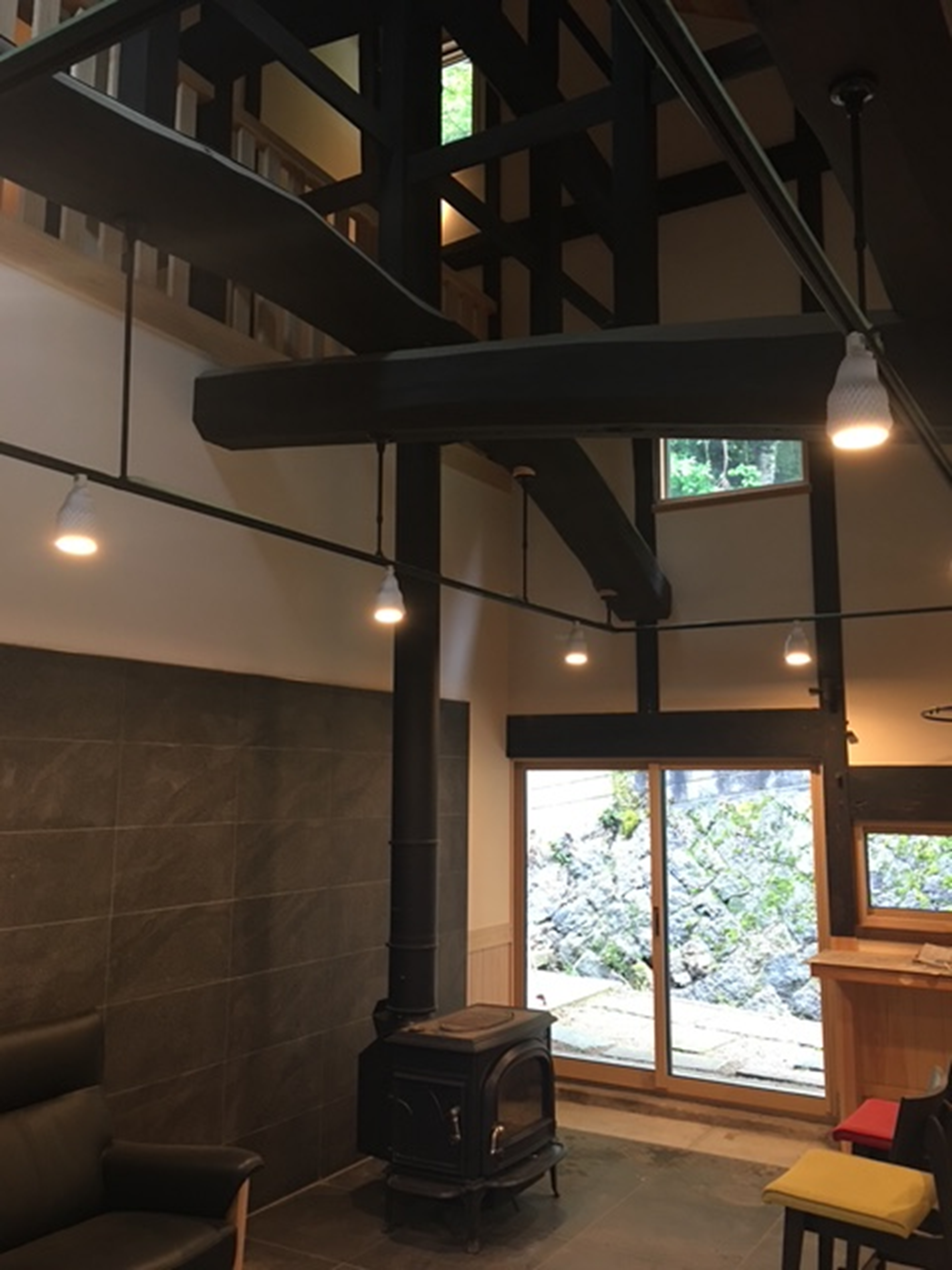 現しとした柱、梁等の力強い木構造の美しさを保ちつつ、現状の傷み等の状況を的確に把握し、柱の根継ぎなどを含め必要な耐震補強を施し、見事に築300年の古民家を再生している。