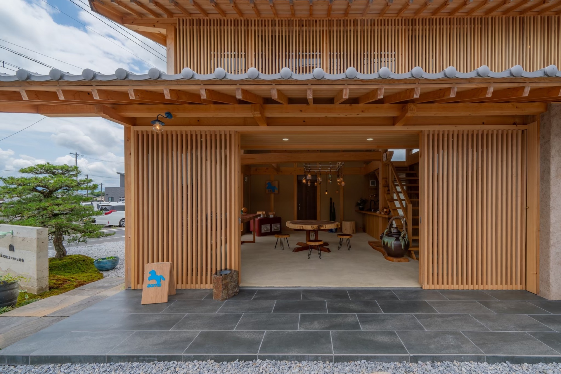 茅葺屋根のシルエットを残した大きな屋根がとても印象的で、伊賀地域の原風景を想起させる佇まいとなっている。