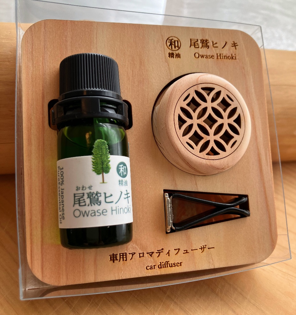 尾鷲ヒノキの精油と、同材を用いたアロマディフューザーのセットです。内蔵のコットンに精油を垂らすことで、車用ディフューザーはエアコンの風に香りをのせ、アロマキーホルダーは持ち歩きながら香りを楽しめます。伝統的な文様である七宝文様をレーザー彫刻することで和の雰囲気に仕上げています。評価のポイント