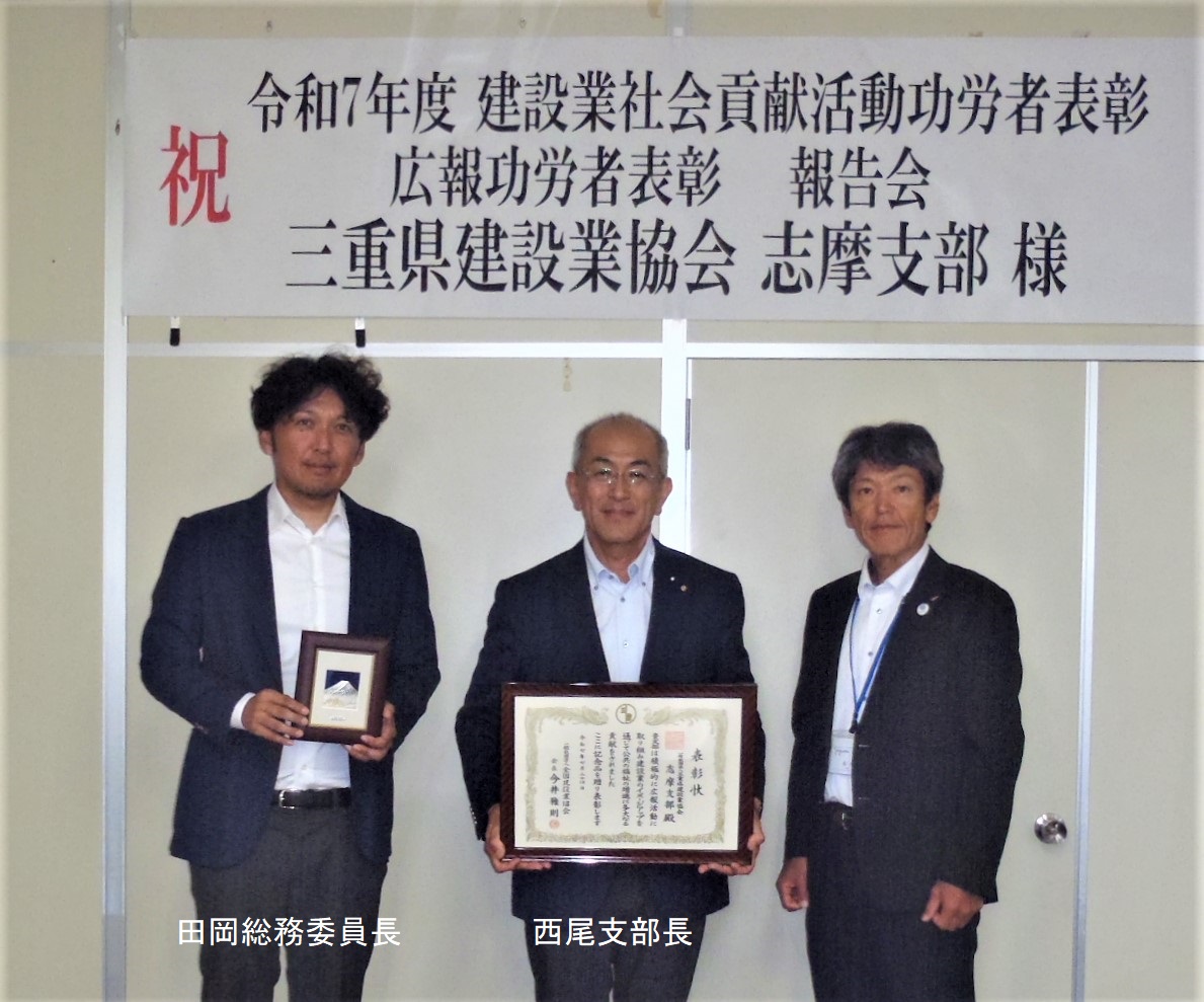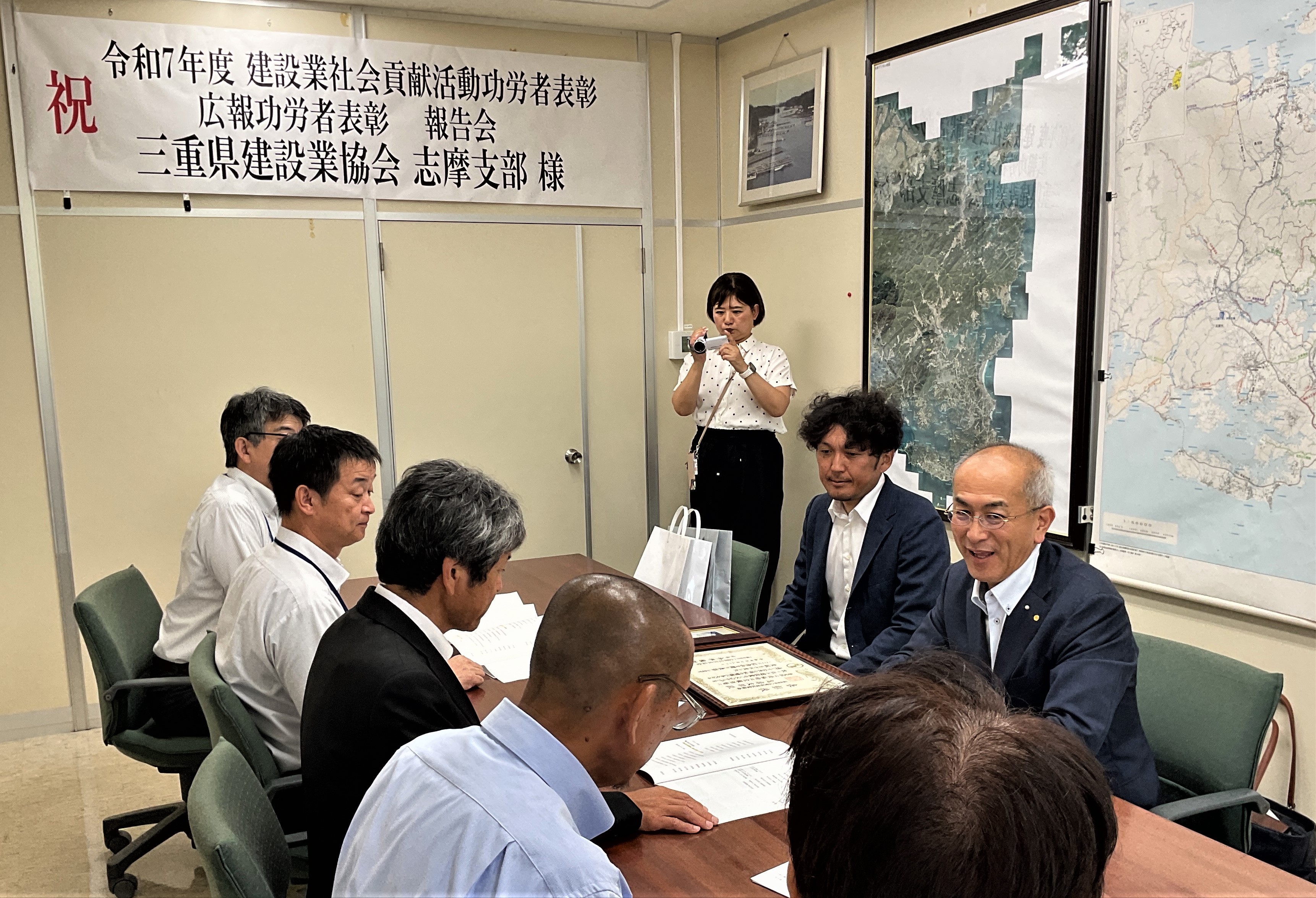 令和7年7月24日、全国建設業協会が開催した建設業社会貢献活動推進月間中央行事において、三重県建設業協会志摩支部が「広報功労者表彰」を受賞されました。 8月5日に志摩支部長と総務委員長が志摩建設事務所に来庁され、受賞の報告を行なっていただきました。 受賞おめでとうございます‼️ 今後も建設業の魅力発信に向けた取り組みを宜しくお願いします✨ 全国建設業協会の表彰式の記事へのリンク <受賞事例の紹介>