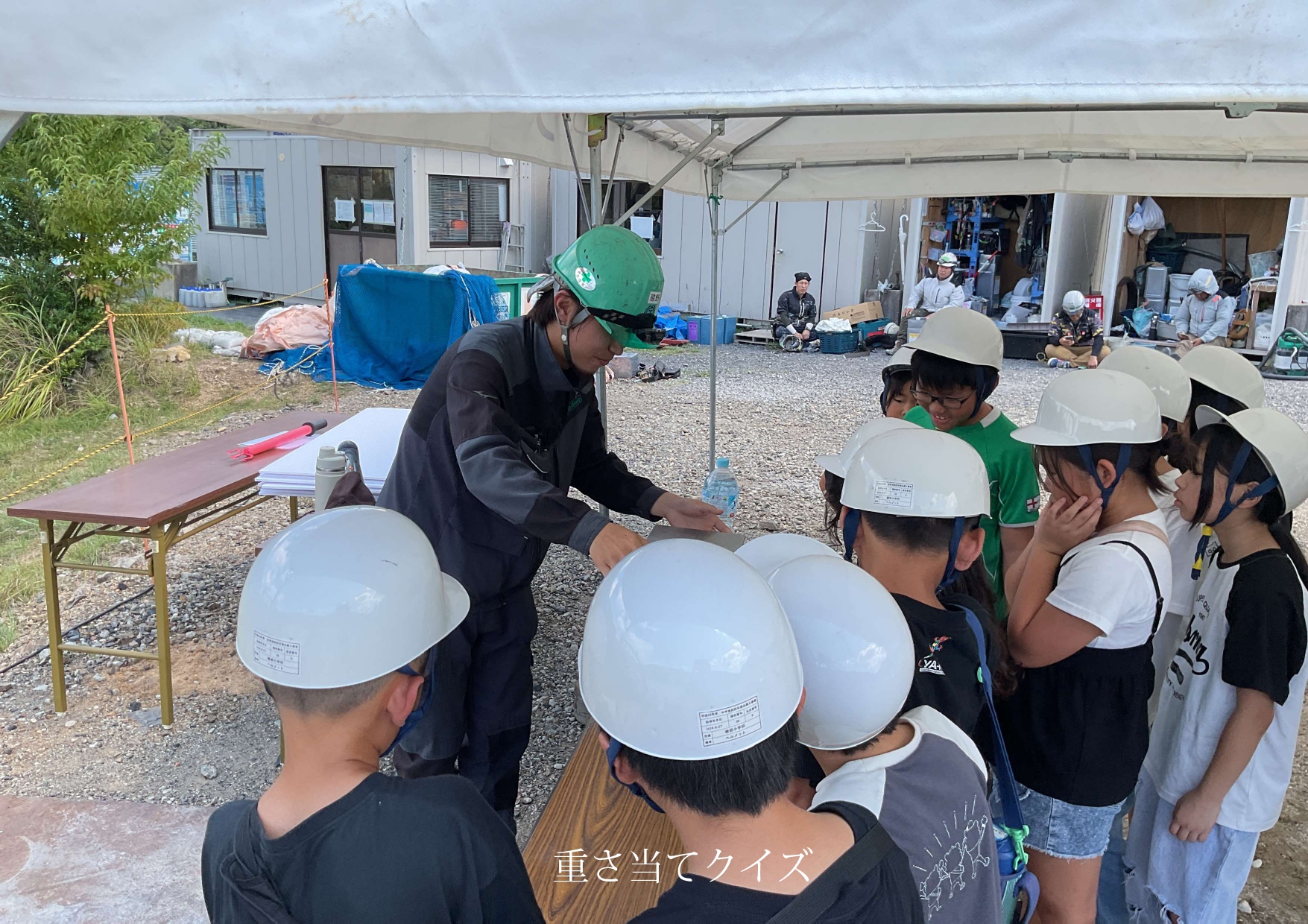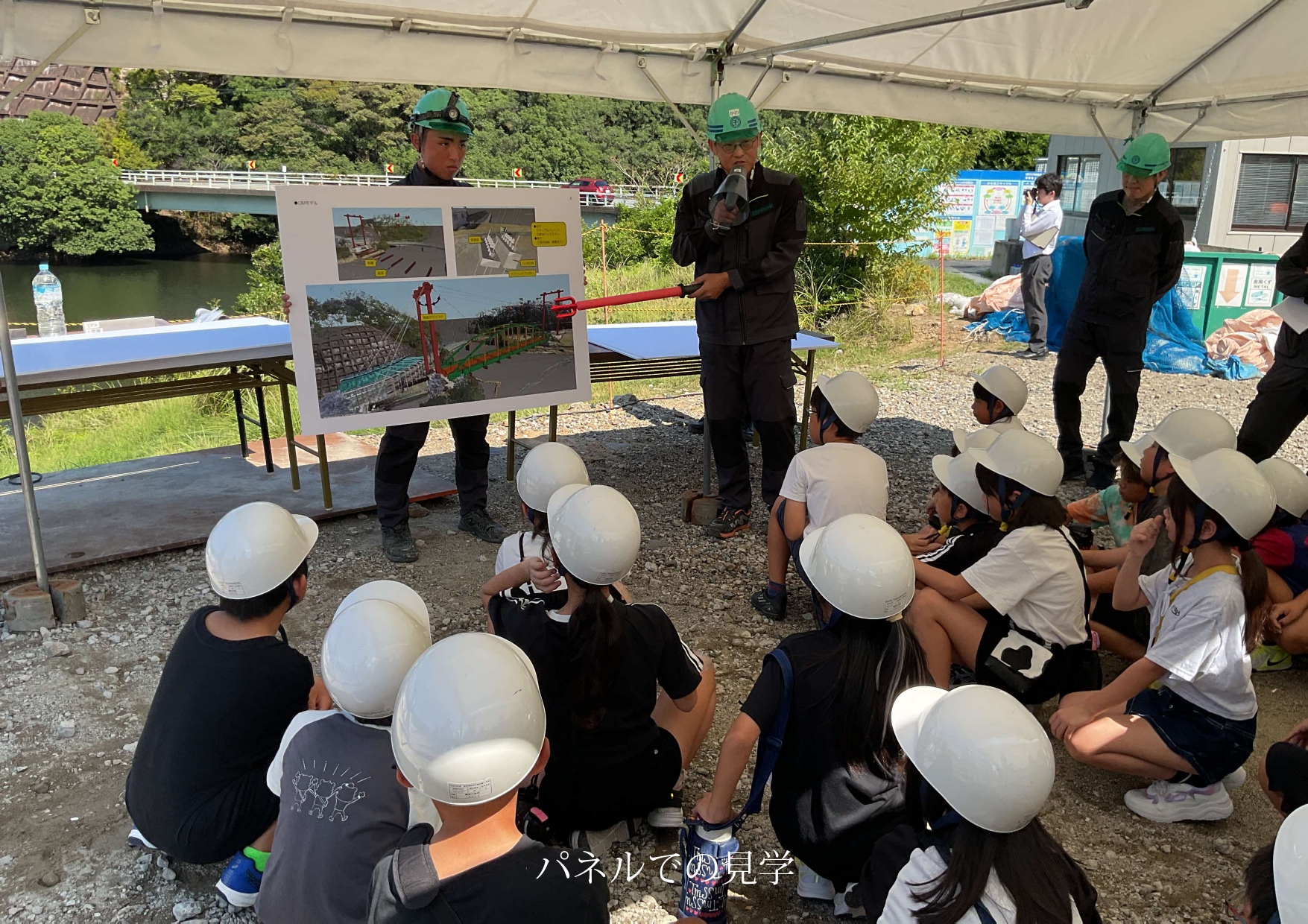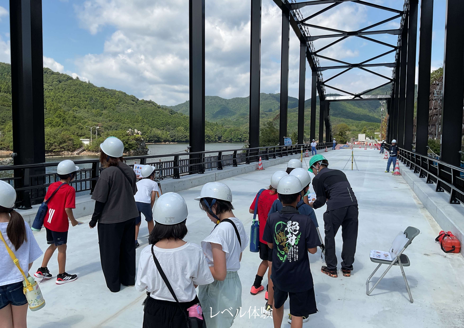 その後バスに乗車し、恵利原橋架け替え工事の現場を見学しました。テント内でこれまでの工事の様子をパネルで説明を受けた後、鋼材を手で持って重さを予想したり、レベル測定器を覗いたり、橋の床にチョークで自由に絵を描いたりといった体験をしました。児童の皆さんは、まだ開通していない橋の上での一生に二度とない体験をできたことがとても楽しそうでした。