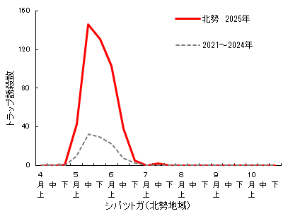 シバツトガ用フェロモン剤の販売中止に伴い、2025年はオオタバコガ用のフェロモントラップに誘殺されたシバツトガ数を記載しています。