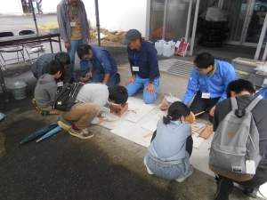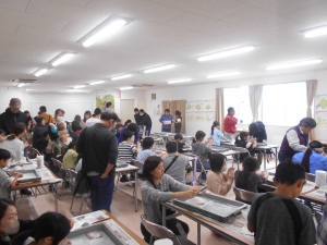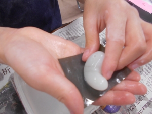材料の滑石を3種類の紙やすりで削っていき、形を作りました。四角形の滑石から勾玉の丸みを帯びた形を作るのはとても大変です。大人とも協力しながら、きれいな勾玉を完成させていました。できあがった勾玉をながめたり、首にかけたりしてとても満足そうでした。何度も仕上げの紙やすりできれいに磨いてはキズがないか確かめて、美しく仕上げようとするお子さんもいました。