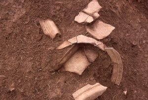 堀切の様子 土師器鍋の出土状況
