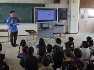 授業の最初に、「むかし」をイメージしてもらうために、時代によって着用している衣類や食事、生活の様子が異なることをイラストで説明し、いろいろな「むかし」があることを意識してもらいました。そのうえで、「埋蔵文化財」とはどういうものかを説明するとともに、埋蔵文化財センターの業務について説明しました。
