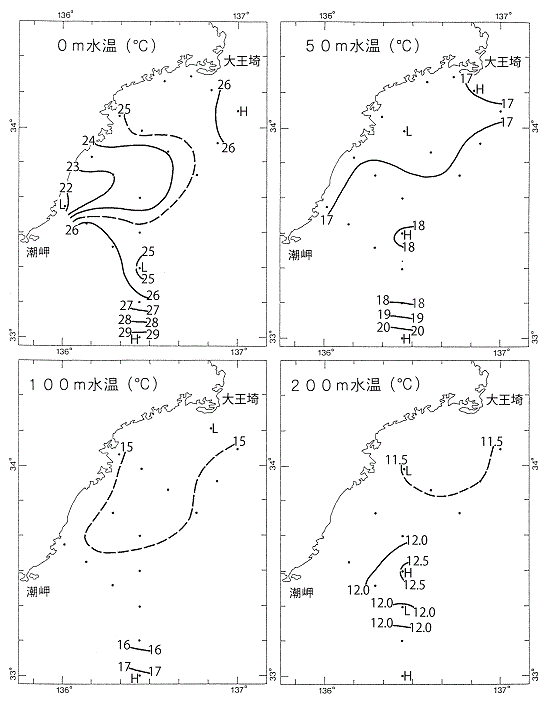 観測時の黒潮は、熊野灘沖で33°00’N以南を東進していたため、調査では黒潮に達しなかった。