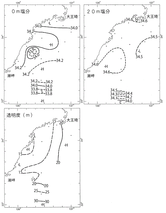 塩分は、表面は33.62~34.39、20mでは33.99~34.63、200mでは34.37~34.42の範囲にあり、表面及び20mでは沿岸湧昇の影響で平年より高く、200mでは平年並であった。表面では測点14,15,17,28、20mでは測点1,5,6,14,22で同日過去最高塩分を更新した。
