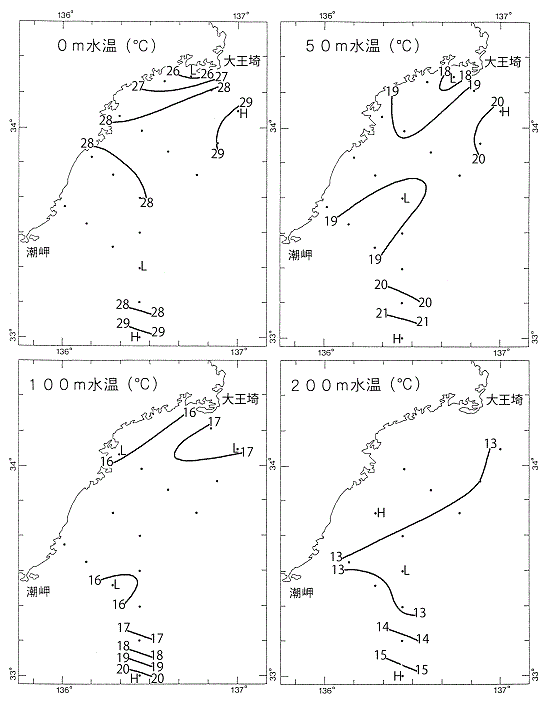 調査時の水温は、表面は25.7~29.4℃、50mでは17.8~21.7℃、100mでは15.7~20.1℃、200mでは12.6~15.6℃の範囲にあった。水温は、南部沖合域(測点13,29,30)を除き、表面では平年より2.5~5℃前後高め、50m、100m及び200mでは平年より1~2.5℃前後高めであった。測点6,9,17,22,26の表面で同月の過去最高水温を更新した。一方、南部沖合域の水温は、表面では平年より1.5~2.5℃前後高め、50m、100m及び200mでは概ね平年よりやや低め~低めであった。