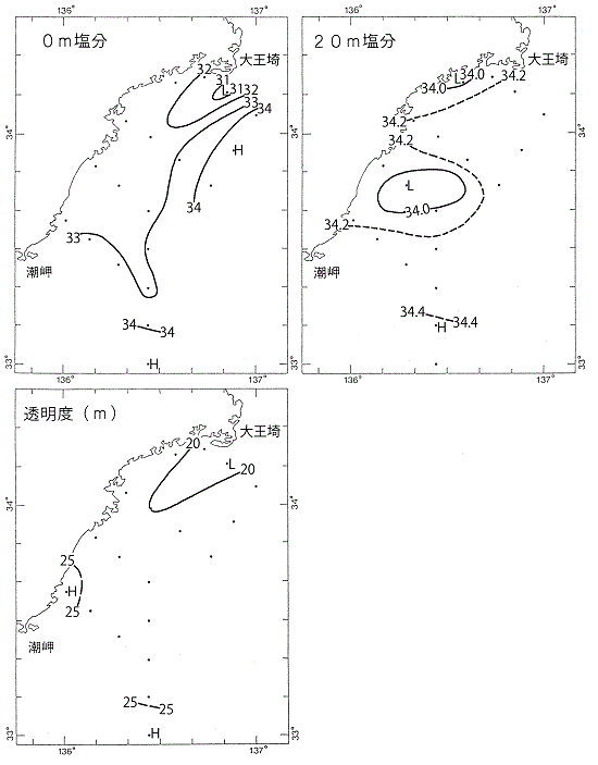 塩分は、表面は30.97~34.34、20mでは33.82~34.49、200mでは34.43~34.60の範囲にあり、沿岸域の表面で平年より低い測点が多かったほかは、平年並であった。