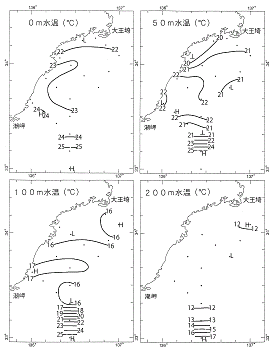 調査時の水温は、表面は21.5~25.9℃、50mでは19.1~25.9℃、100mでは15.1~25.7℃、200mでは11.1~17.5℃の範囲にあった。水温は、表面では概ね平年並~平年より1~2℃ほど高め、50m及び200mでは平年より1~2℃ほど低め~平年並、100mでは測点13で平年より約4.5℃低めであったほかは、平年より1~2.5℃ほど低めであった。測点17の表面では同月の過去最高水温を更新した。南部沖合域(測点29,30)の表面及び50mの水温は平年より約1.6~1.8℃高めであった。測点29の100mでは平年より約0.7℃高め、200mでは平年より約2.3℃低めであった一方で、測点30の100mでは平年より約4.5℃高め、200mでは約1.2℃高めであった。また、測点29,30の表面、測点29の50m、測点30の100mで同月の過去最高水温を更新した。