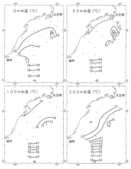 調査時の水温は、表面は15.2~20.7℃、50mでは14.7~19.9℃、100mでは12.4~19.8℃、200mでは9.6~18.1℃の範囲にあった。水温は、南部沖合域(測点29,30)を除き、表面では概ね平年並、50m、100m及び200mでは平年より約1~2℃低め~平年並であった。また、南部沖合域(測点29,30)では、測点29は平年並~平年より約1℃高め、測点30は平年より約1~2℃高めであった。